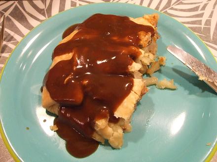今日は夕食にコニー(ホストマザー)と一緒にミートパイ(?)を作りました。実は名前は○○パイって言ってたけど、忘れましたw作り方は意外と簡単。1、じゃがいもと玉ねぎを5ミリ角に切る。2、豚と牛の合びきに卵とパン粉入れ、混ぜる。3、バターを引いたオーブンのトレイにパイ生地を広げ、 そこにじゃがいも・玉ねぎ・肉を3段重ねる。4、塩・コショウを少々。5、バターを薄く切ってのせ、中身が出ないよう四つ端を閉じる。6、350度のオーブンで約40分焼く。7、グレービーソースを水に溶かし、温める。8、皿に盛り付け、ソースをかけて出来上がりいや~美味しかった!!こんな食事にはダイエットペプシが良く似合う
