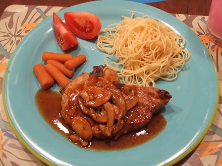 ポークチョップを作りましたパスタにちょこっとレッドペッパーを入れたら思いのほか辛くてビックリしちゃった