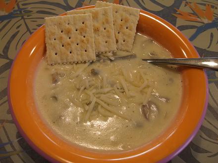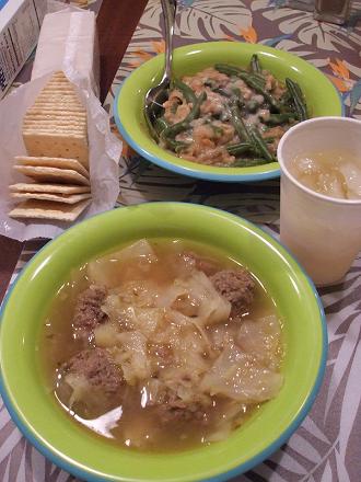 スープを作ってみました。サンクスギビングの時に食べたマッシュポテトとグリーンビーンズを使わないとっと思って。クリームシチューみたいになって美味しかった