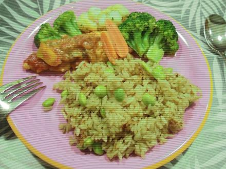 枝豆ご飯にしてみましたそして、おかずは鳥のささみにトマトソースとチーズをのっけて焼いたもの。一緒にブロッコリーも♪ご飯をダシで炊いたので、下がちょっと焦げてしまったのですが、味はなかなかのモノでした画像が悪いので美味しそうに見えませんが、美味しかったんですよ!!