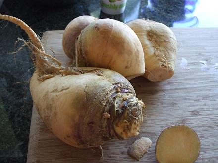 この野菜は一体何なのでしょう???見た目はだいこんっぽい。切るとこんな感じ。中身はさつま芋みたい。でも、味は大根でした。きっとアメリカの親戚なのでしょう。