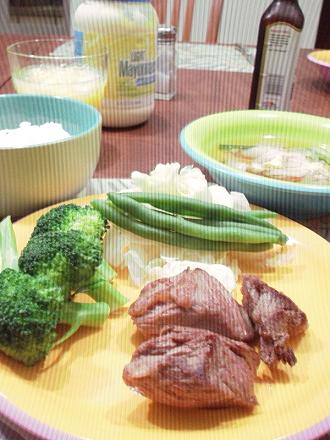 今日の夕食画像が汚いですが、気にせずに*ブロックの牛肉に塩コショウ・ガーリックパウダー をかけて焼いた物。*茹でたブロッコリーとインゲンと蒸したキャベツ*かにカマとねぎと卵のスープブロックのお肉は焼いて食べない方が美味しいと思われますw