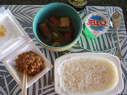 納豆にはタレがついていませんでした。でも、からしはついていました。しょうゆでは味がモヤッとします。あと3パックあります夕食にはキャベツとベーコンとジャガイモのスープを作りました。これはヒットでしたぁまた作ろう♪その他は昨日買ったミートローフとパンんで~、デザートに小さなドーナッツ美味しいけど甘いので一つで止めておきました。あっ!!CSI:マイアミが始まったので集中します
