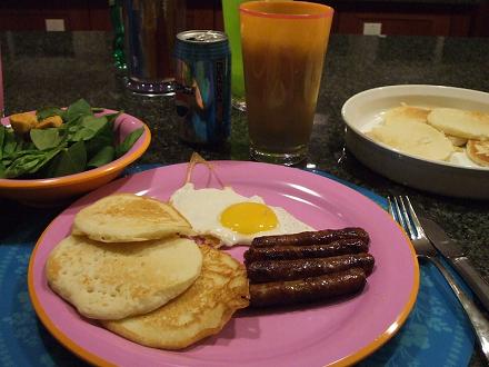 今日のsupperパンケーキ・ソーセージを焼いた物・ベビーリーフのサラダ今日はキレイに撮れた