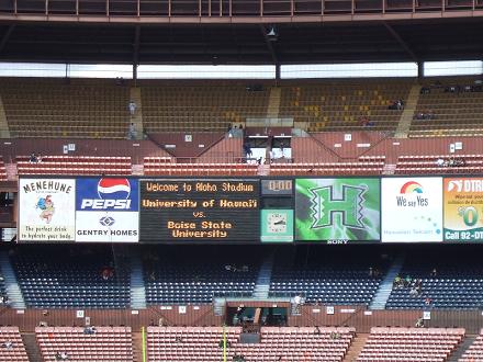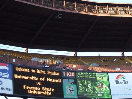 ついに観に行くことができました!!アメリカンフットボールUniversity of Hawaii VS Fresno state universityもちろん私はUHを応援しました。ルールは始まる前に説明して貰ったのですが、いまいちよく分からないので、場の雰囲気でキャーキャー騒ぐビールとチップスをお供に観戦。チアリーダー可愛かったなぁUHのマスコット(?)って人間じゃんwまぁ、とにかくUHが勝ったので良かった♪