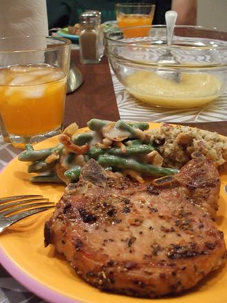 写真だと大きく見えるけど、そんなに大きくはありません。・ポークチョップ・グリーンビーンズ(いんげん)のサラダ・ダイエットサンキスト(オレンジのジュース)