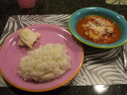 でも、やっぱりトマト味芸がありません。・白いご飯・マッシュポテト・鳥のササミと枝豆とキャベツをトマト味に煮た物 (上の白いのはモッツァレラチーズ)
