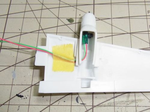 エンジンナセルに、モーターを埋め込む。(途中の写真撮るの忘れた)翼端灯の光ファイバを通すための溝を掘る。光ファイバの直径を避けるため。翼の両側のパーツに溝を掘る。チップLEDを接着した光ファイバを、主翼パーツに接着する。今日は、ここまで。