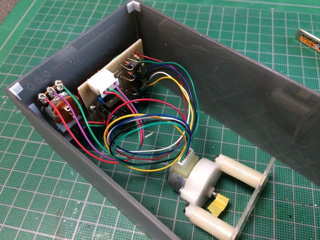 とりあえず、火を入れてみた。ボリュームの電圧をA/D変換して、値に比例してモーターに入れるパルス幅を調整。減速機付きのモーターなので、これが最高回転速度。