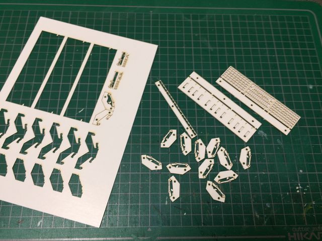 空母のカタパルトに付き物の、ジェット・ブラスト・ディフレクターを作る。これも、飛行甲板のキットに付属している。レーザーカットのペーパークラフトになっていて、パーツを切り離して貼り合わせる。この後、着色して組み立てる。