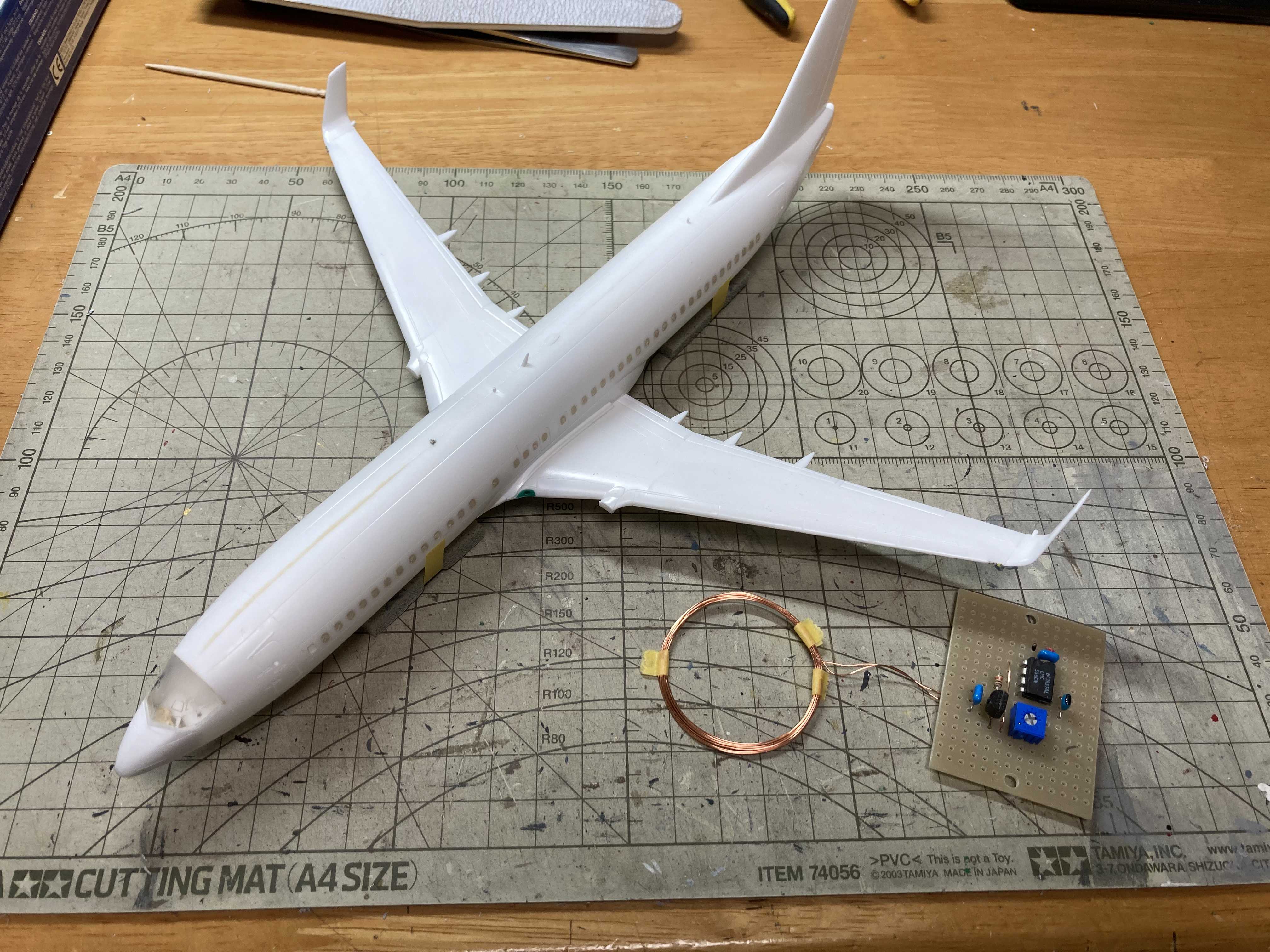 またまた寄り道です。Twitterの企画に乗って、旅客機の製作を始めました。この派手なデカールとキットの窓の位置が合わないので、窓埋め作業から開始。窓埋めには、木工パテを使用。チューブから絞り出すだけで使え、無臭なので締め切ってエアコン効かせた部屋での作業も苦になりません。電飾は標準装備ですので、点滅回路も作製。今回は、ワイヤレス給電に挑戦します。