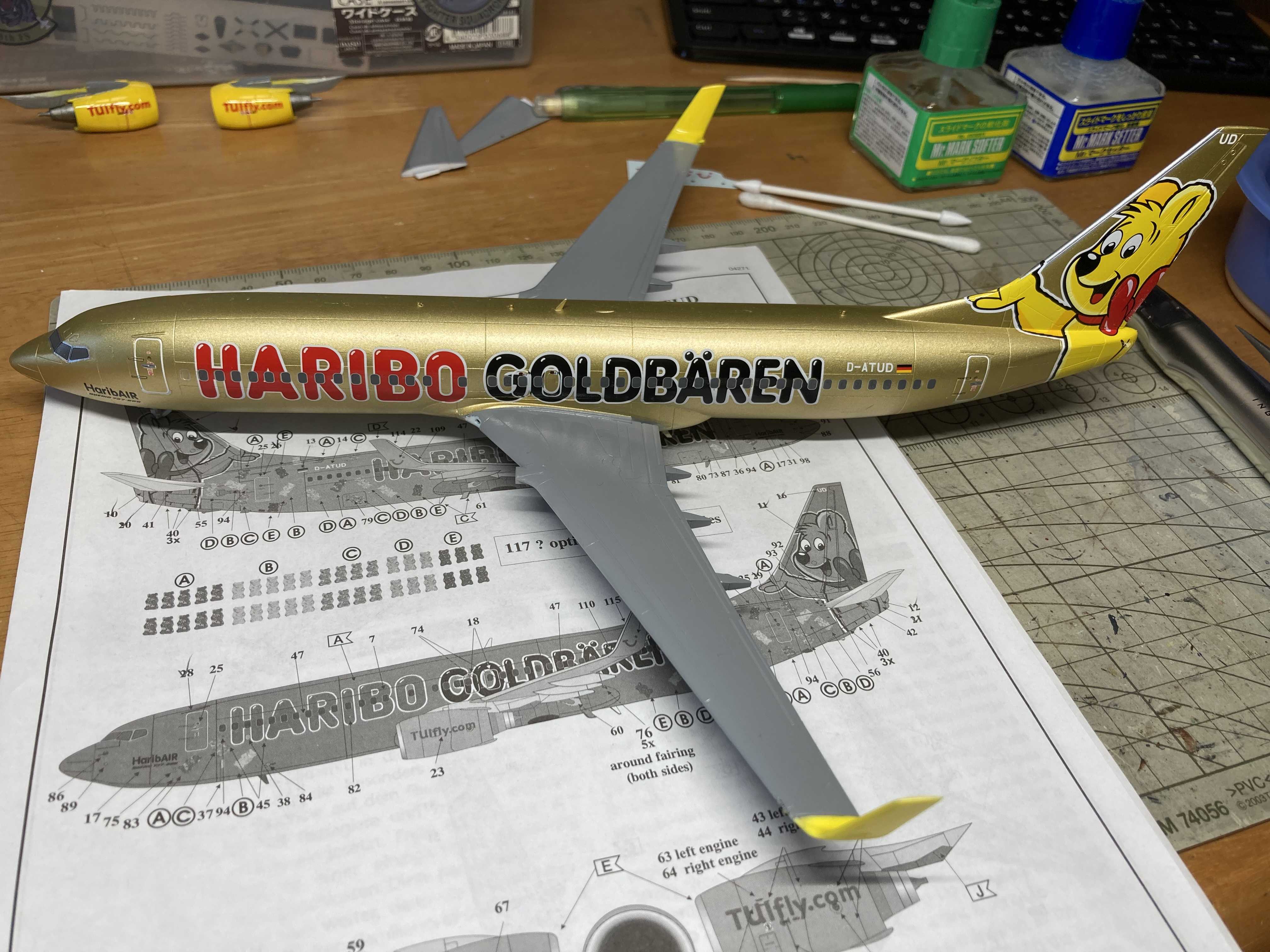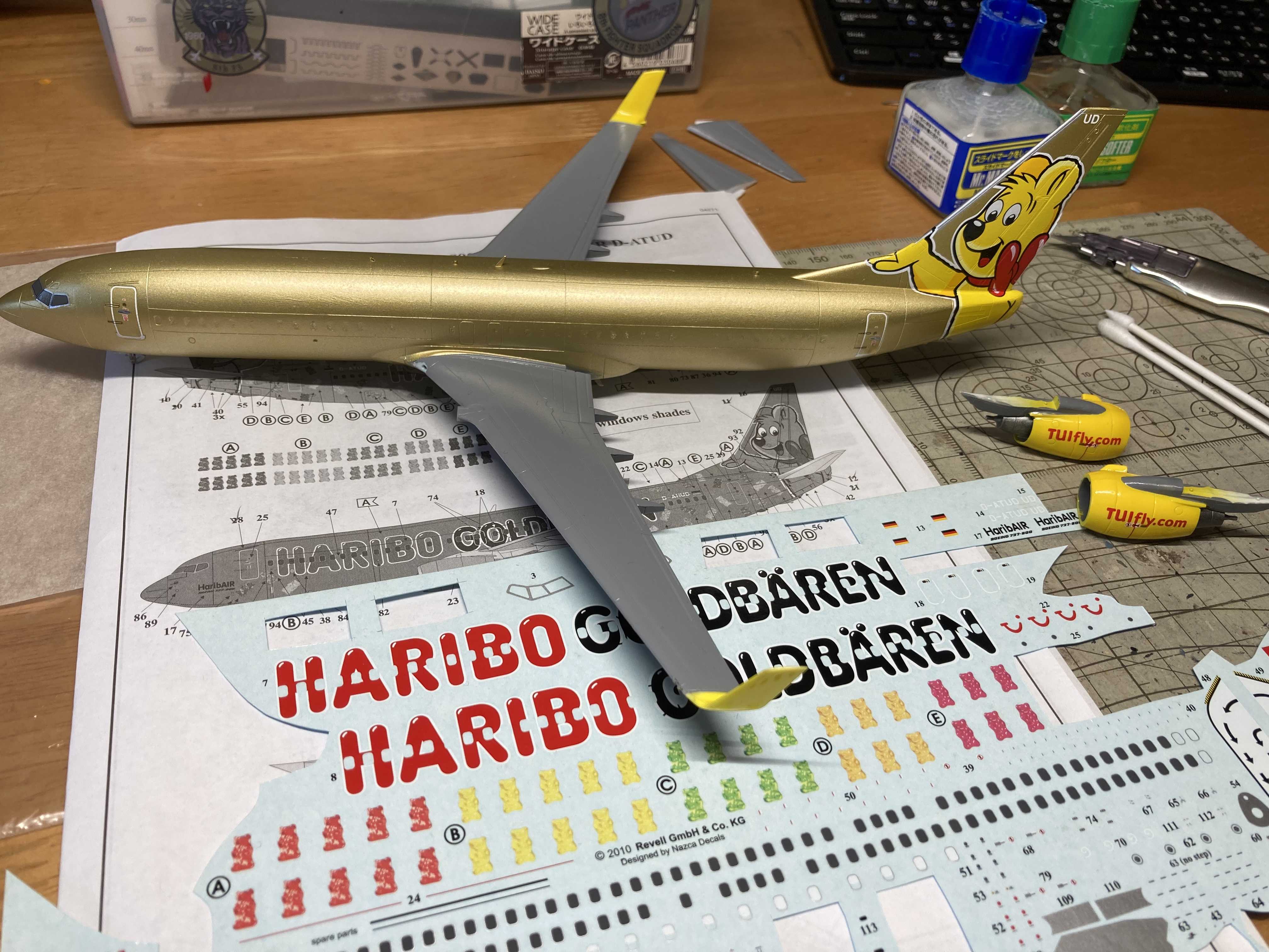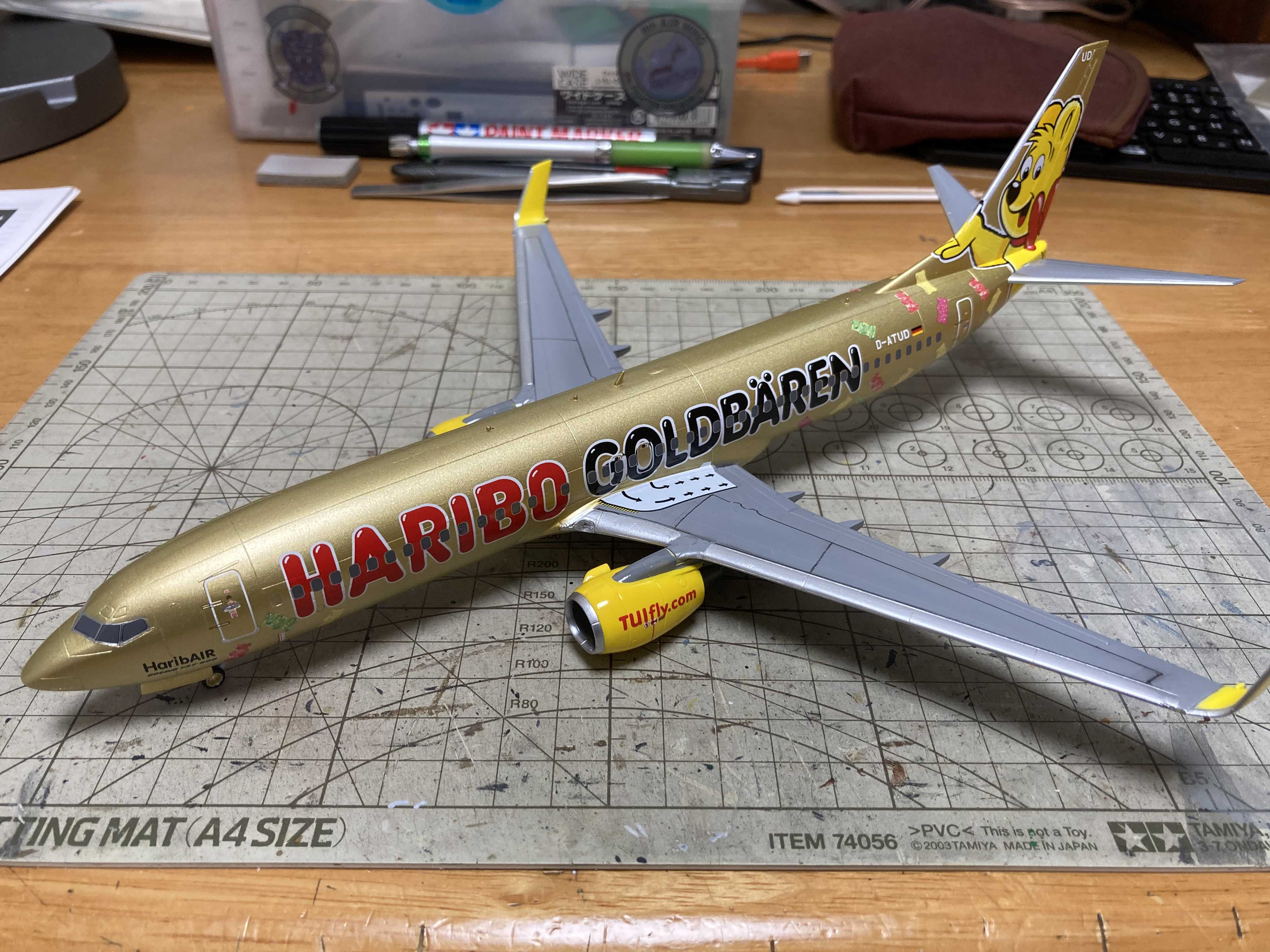 細かいデカールをようやく貼り終え、エンジンと水平尾翼も取り付けました。このクラスの旅客機を作るのは久しぶりでした。サクッと形になるし、場所もとらないので、いいなと思いました。