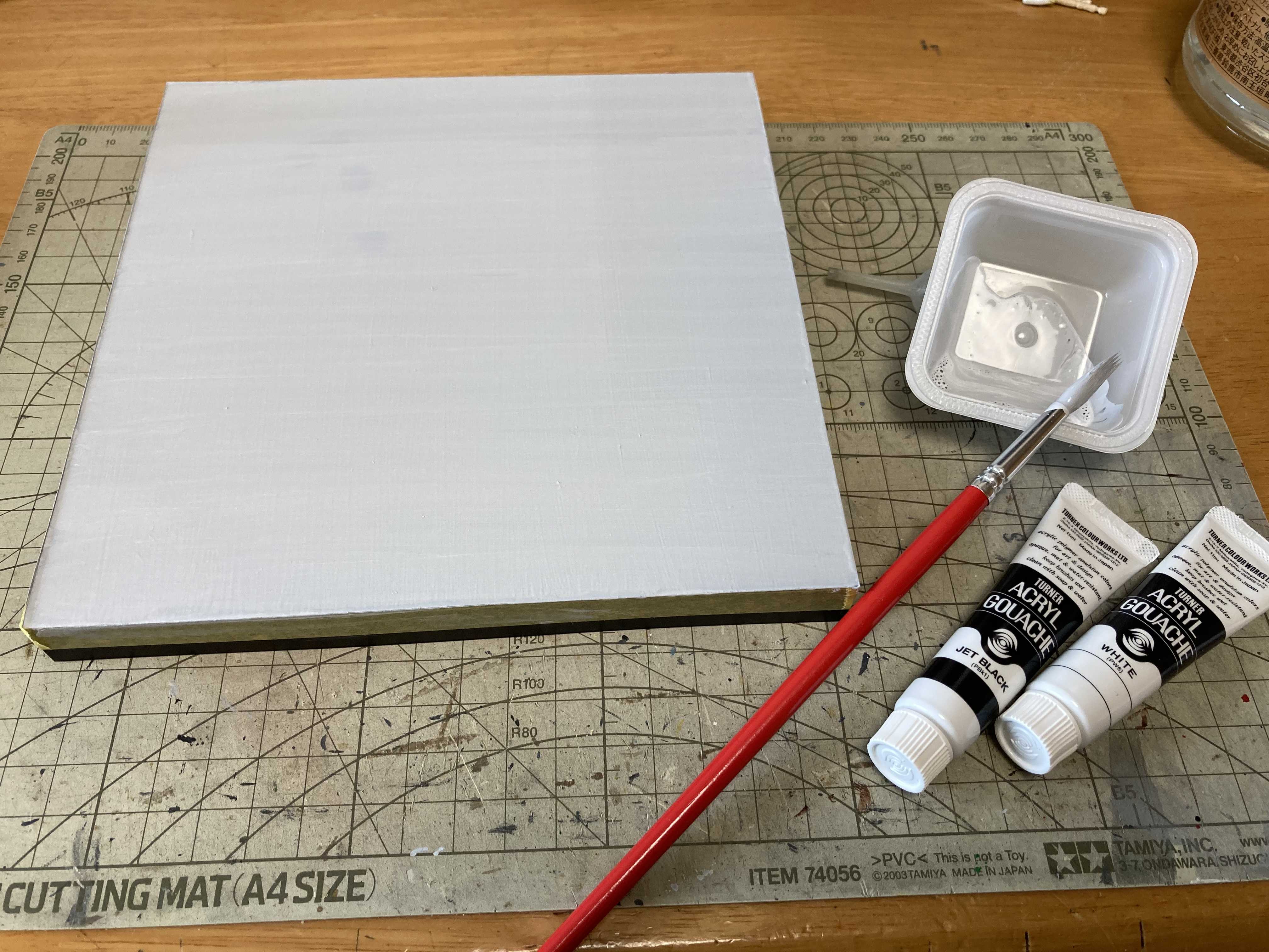ワイヤレス給電ユニットを仕込む展示ベースを塗装します。今回は、アクリルガッシュを使いました。白に黒を混ぜて、コンクリートっぽい色に調色しました。マスキングして、空港エプロン風にラインを引きます。これもアクリルガッシュです。ベースに乗せて、完成です。