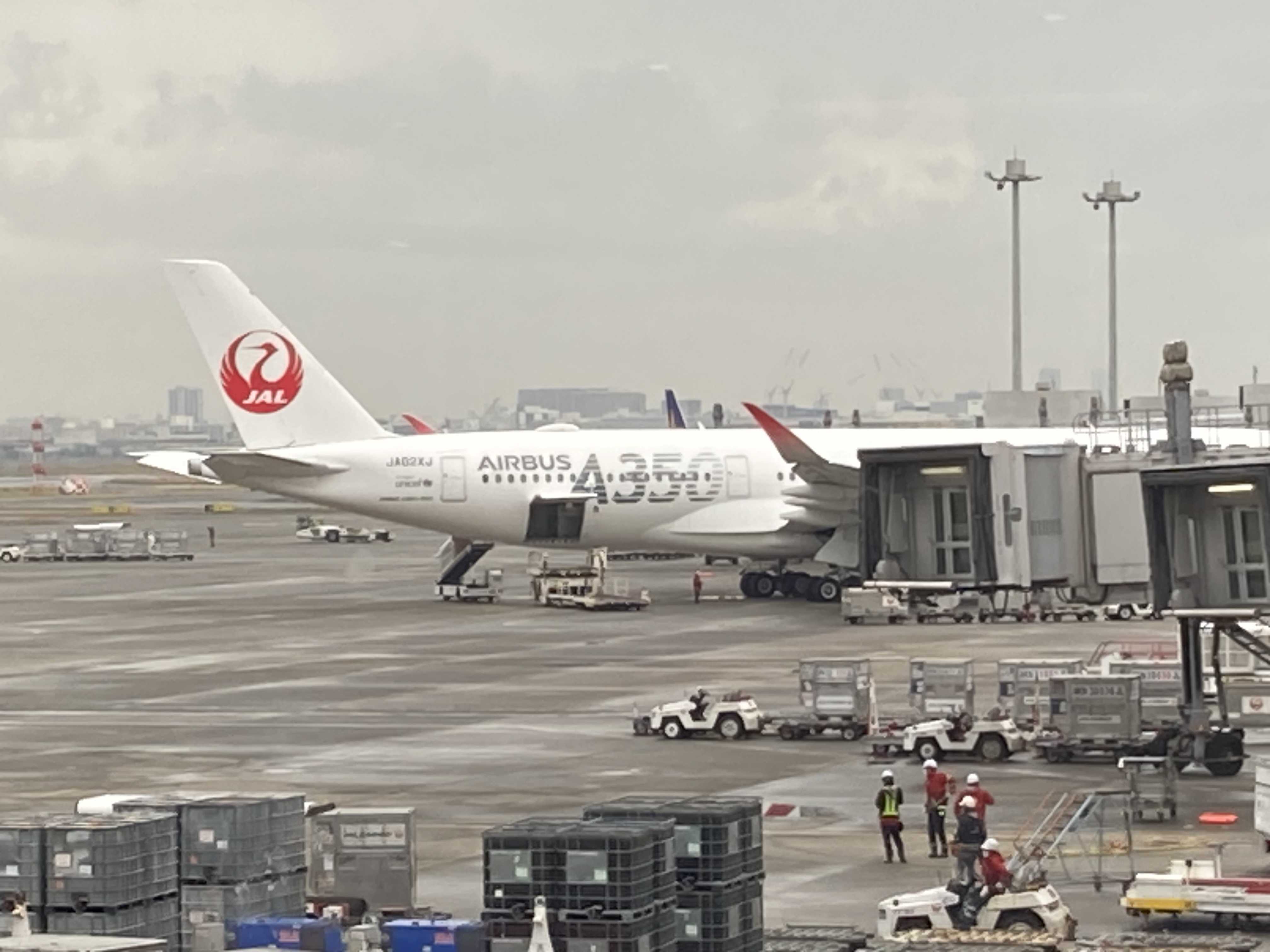 天気がイマイチですが、1タミからみた風景。JAL A350 2号機(JA02XJ)すれ違うスカイマークとJAL。小さくてすみません、ルフトハンザの新塗装。