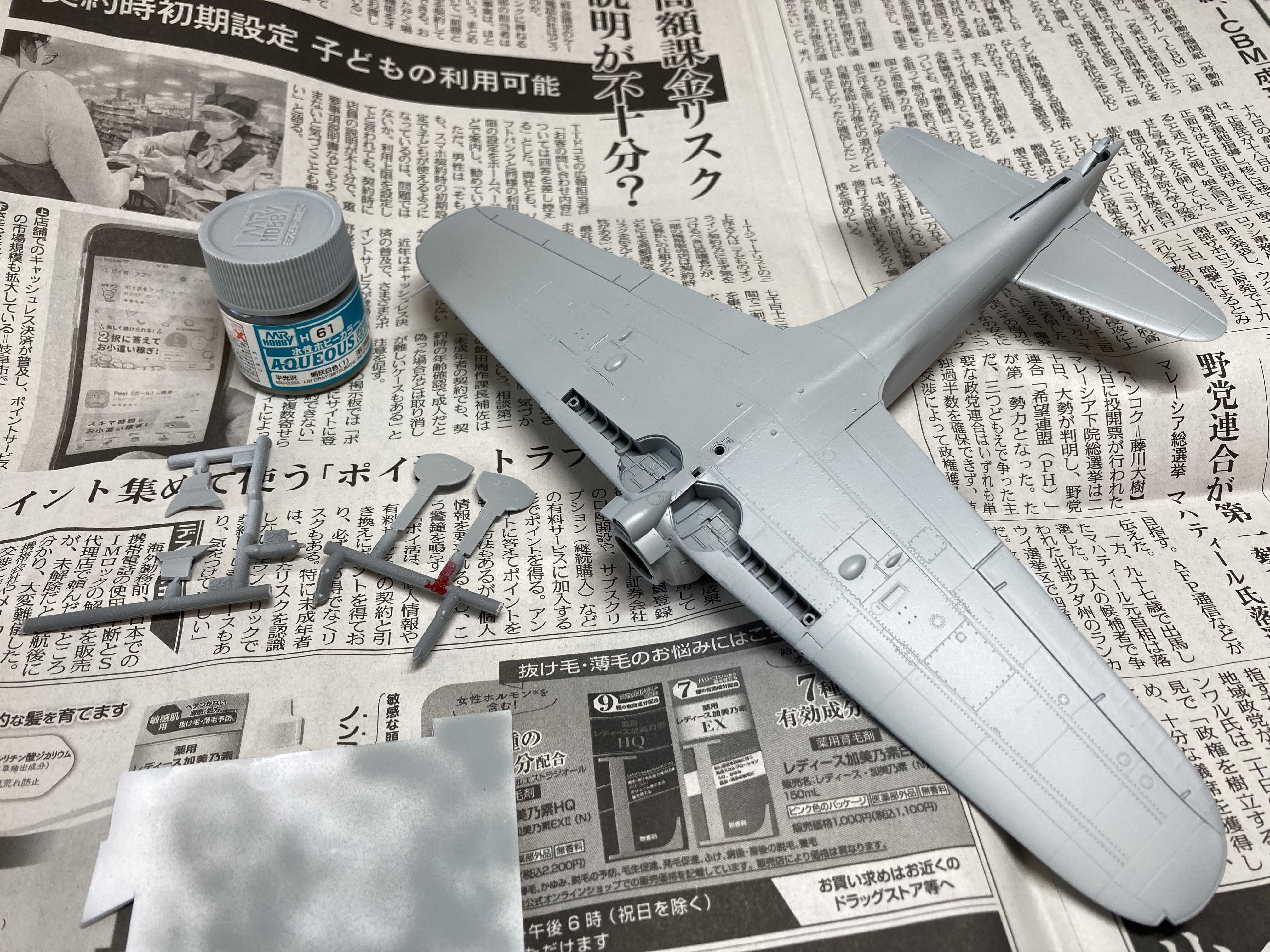 零戦52型、サクッと形になりました。エアブラシ塗装に備え、コクピットをマスキング。翼端灯はクリアパーツなので、先にマッキーで塗っておきます。キャノピーのマスキングには、マスキング販売のマスクシートを使います。ゲートの位置がキャノピーの開口部にあるので、ランナーに付けたままでマスキングし、このまま塗装する予定です。エアブラシ塗装で裏側に吹き込まないように、裏側にマスキングゾルを塗って保護します。
