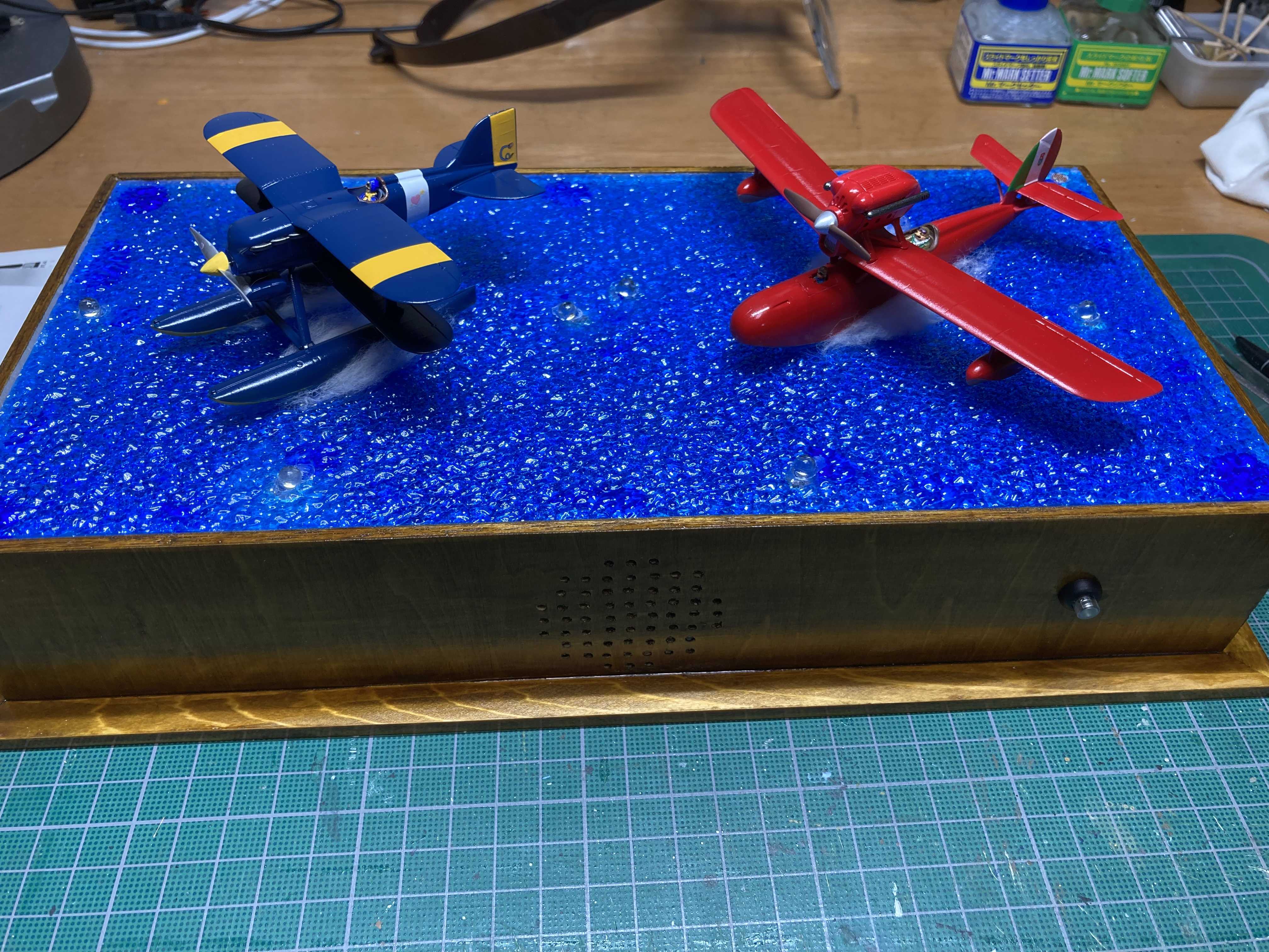 アニメ映画「紅の豚」に登場する飛行機を作りました。11月13日に浅草橋の東商センターで開催される「宮崎メカ模型クラブ展示会」に出展します。台座に乗っているのは、ギミックを仕込んでいるからです。