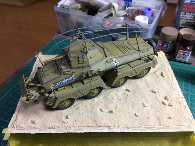 タミヤのテクスチャーペイントを塗りたくって、車体を配置してみました。