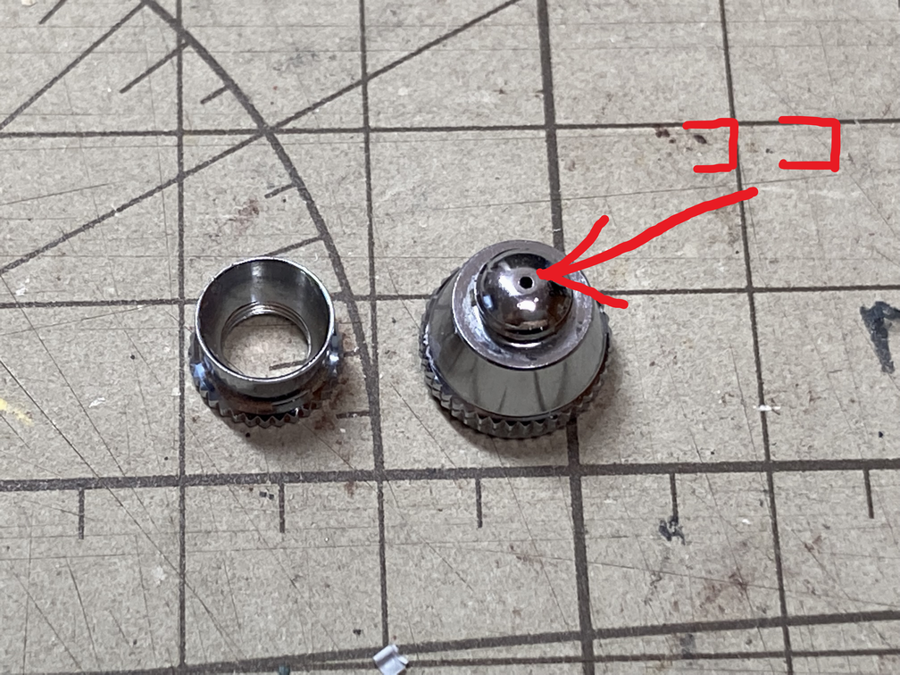 TAMIYAの0.3mmエアブラシ(スプレーワーク HG エアーブラシ)が、この写真のように突然ヘンな方向に塗料を噴き出すようになってしまいました。