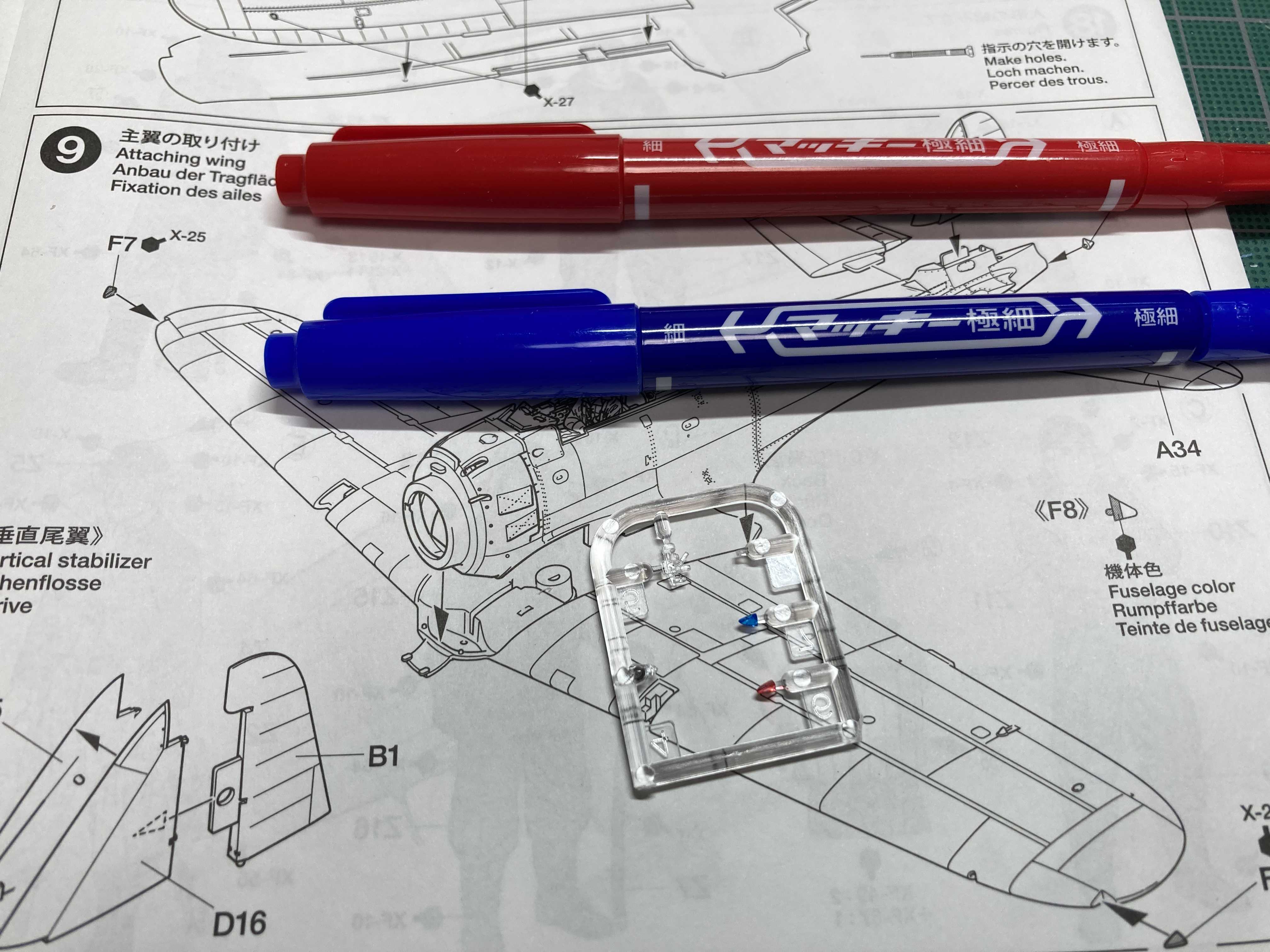 翼端灯はクリアパーツなので、先にマッキーで塗っておきます。