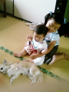 蒸し暑いですが、くっついて、ご機嫌です!ロングコートチワワの『さくら』は、おつきあい・・・・Hollyがタッチ!な~に??