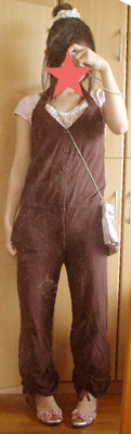 いつもの私と180度違う服装。笑える。茶×ピンクでアポロ配色でまとめてみましたー すげぇ足短く見える…☆・,。・:*:・゜'・☆・,。・:*:゜'・☆・,。・:*:・゜'・☆・,。・:*:゜'・☆・,。・:*:゜'・☆・ホルターネックサロペット (cantwo)・ピンク×白ボーダーカットソー (ユニクロ)・リボン付ピンクパンプス (トゥインクトゥインク)・シャイニーピンクバッグ (モノコムサ)・白レースシュシュ (しまむら)・星ペンダント(パリスキッズ)・星ピアス (ノーブランド)☆・,。・:*:・゜'・☆・,。・:*:゜'・☆・,。・:*:・゜'・☆・,。・:*:゜'・☆・,。・:*:゜'・☆服の整理してたら出てきた懐かしい服着てみました。確か4~5年前にマルイで買ったサロペット。腰のところに小さいリボン付いてて後姿もかわいーの!でも2回ほどしか着てないという。ぶっちゃけサロペはトイレめんどい(笑)当時は今ほどオンナオンナした服装でなかったので。買ってた雑誌はwithとたまにnonnoだったし。20前半でノンノもイタイか(笑)ユニクロカットソーも2年前買ったのかな?バッグは3~4年前にお台場で買って今日初めて使った(…)パンプスはぺたんこです。ケイタを妊娠中の時に買ったから3年前?星ピアスはもう覚えてないくらい昔です。そんなわけで今年購入した物はシュシュとペンダントだけ。スゲー!(笑)こういうの何系っていうんだ?内股系?というかこういう格好すると自然と内股になるのが不思議だ。ヘアはおろしたり巻いたりしてると変なのでお団子にしてシュシュ。後れ毛も少しだしてみた。
