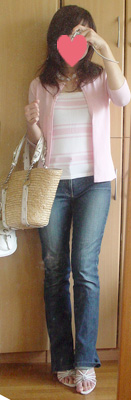すげぇ地味かも。年相応というか30代でもいけそうな。☆・,。・:*:・゜'・☆・,。・:*:゜'・☆・,。・:*:・゜'・☆・,。・:*:゜'・☆・,。・:*:゜'・☆・ボーダーベアトップアンサンブル (INGNI)・ブーツカットデニム (SOMETHING)・白×クリアボールネックレス (パリスキッズ)・シェル×シルバーピアス (ノーブランド)・カゴバッグ (ビアデミゾン)・白サンダル (prompromshop)☆・,。・:*:・゜'・☆・,。・:*:゜'・☆・,。・:*:・゜'・☆・,。・:*:゜'・☆・,。・:*:゜'・☆今日のお出かけは実家・しまむら・ミスド・スーパーだけ!!オリーブのワンピを白Tと重ね着でもして出かけようかと思ったけど実母に「何そのカッコ…( -д-) 」と言われるのが予想できたので地味に。薄ピンクのアンサンブルは4年前くらいにヴィーナスフォートのINGNIで購入。セールでめちゃめちゃ安かったから買ったっけ。当時はよく着てました。デニムはもういつ買ったか覚えてないくらい昔。ボールネックレスは去年の夏にパリスキッズで購入して自分で少し改造。カゴとサンダルとピアスは2~3年前購入。今年買った服、たくさんあるんだから着ろよ…