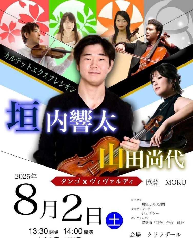 旅行記の途中ですが、ここでちょっとお休みして昨日出かけたコンサートの様子を載せたいと思います。朝早くから東京の先生のスタンダードレッスンを早めていただき受け、1時間受けてから、スタジオの先生のラテンレッスンを受け、お昼までに自宅に戻り、衣装を変えてから最寄りの駅まで急ぎお友達と合流しJRに乗って岐阜まで出かけました。岐阜駅でちょっとしたハプニングもありましたが、タクシーで午後1時半までに会場入りできました。コンサートは午後2時から開演でした。先ずカルテットエクスプレシオンの演奏が8曲ありました。後半はタンゴの曲を演奏してくださいました。休憩をはさんで垣内響太さんと山田尚代さんが加わり、ヴィヴァルディコンサートがありヴィヴァルディの四季春、夏、秋、冬の全3楽章をそれぞれ演奏されました。私の座席からは垣内さんが写りませんでした。演奏後、拍手が鳴りやまずアンコール曲にバッハの曲を弾いてくださいましたアンコール曲も含めて午後4時前にはコンサートが終了しました。終演後、演奏家と記念写真を撮りました。いつもの推しのチェリストとカルテットメンバーのヴァイオリニストと一緒にお友達も加わって記念にとても若くて才能あふれるヴァイオリニストの垣内響太さんと記念に。経歴は書きませんがヨーロッパ各地及び日本各地で活躍を続ける若手ヴァイオリニストです。チェリストも加わってスリーショットで終演後、記念撮影をしてから帰りました。お友達と電車の往復、話し続けてあっという間に最寄りの駅に到着。楽しい時間を過ごしてきました。