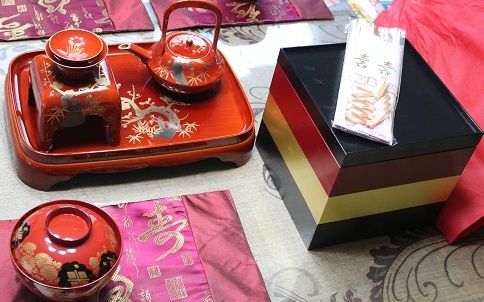 犬の置物の後ろに「福」の陶板を飾ってあります。
