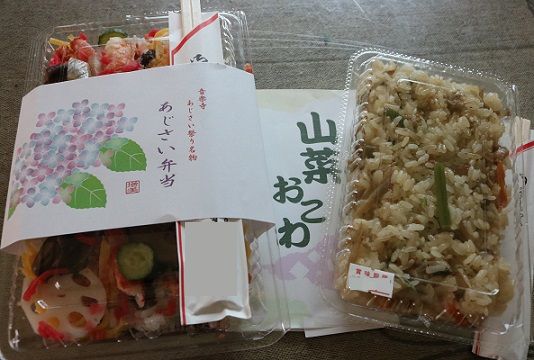 お昼用にあじさい弁当と山菜おこわを買ってきました。
