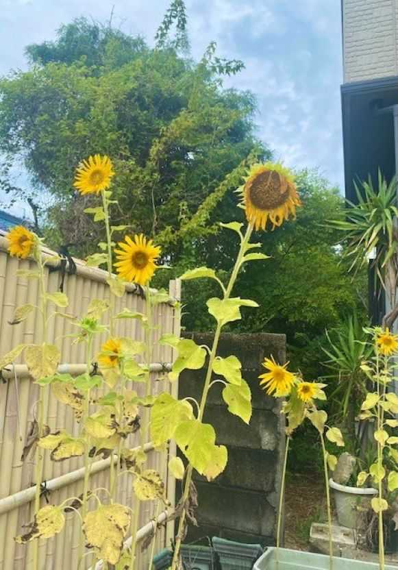 H 先生の畑では大きな向日葵の葉っぱが枯れて