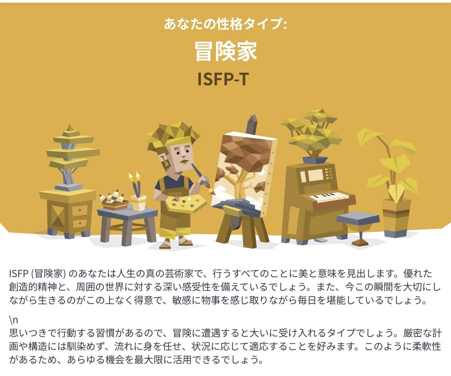 まいどどーも。11月27日。木曜日を迎えた ばんぶー です。今日は出勤ですよ。激萎えですね。今週は月曜日が休みだったじゃないですか。その影響で木曜定休が削られちゃったんですね。でもみんな木曜日を休む習慣が付いてるんです。有給休暇取得者続出!気持ちは分かります。ばんぶーさんも気付いて届を出そうとしたら・・・取得者が多すぎてダメでした。助けて、労働基準法!さて、本日のネタは性格診断テスト。一時期こんなのが流行りましたよね。16Personalities←リンク先参照簡単な質問に答えていくと特性が分かっちゃう優れもの。しかも無料で細かい結果が出てくる。まあよくあるやつですね。若いインストラクターね〜ちゃんたちが盛り上がっていたんで、やってみました。約10分で診断できちゃうんですね。でも結構時間がかかったような気が。途中で飽きちゃうかと思いましたよ。そして気になる結果は?さあここで宣伝だ。本やゲームはここから注文するんだぜ!性格診断系の本って、昔「動物占い」ってのが流行ったよな。うさぎとかコアラとか。でも一瞬で廃れたよな。流行なんてそんなもんだよ。続き。テレビ番組の構成みたいに結果発表の前に宣伝を挟むスタイル。そして結果は?冒険家 ISFP-T黄色いやつです。←ね〜ちゃんたち、色で言ってたばんぶーさん、芸術家なんですって。今この瞬間を大切にしながら生きているのかぁ。間違ってはいないですね。思いつきで行動する習慣もありますね。←ふと思い立って金沢競馬場とかこれの見方はよく分かりません。感情型で内向型?課金すれば細かい内容まで見れそうですが、無課金派なんで見れません。職人技、かぁ。今の仕事、ある意味職人の世界ではあるんですが。美と実用性を結びつける?いかにセクシーな手捌きでシフトチェンジするかを追求して一部界隈で広めたことはありましたかねぇ。そんで出世街道には乗れないみたいです。まあ現在の副校長って立場も合ってないと思ってますし。校長なんてなる気はないし。定年まで自由に過ごせればいいかなって思ってます。こんな結果が出ました。他にも様々なタイプが存在します。嫁氏はエンターテイナーだったようです。どーせこのタイプ別の相性とかあるんでしょうね。気になる人は基本無料だからやってみそ。さて、出勤で激萎えな木曜日。無理せずテキトーに頑張りましょう。ほなほなノシ