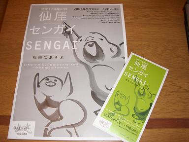 以前、丸の内の出光美術館で風神雷神が公開されていた時に、おまけで(というと失礼だけど)展示されていた禅僧の仙がいさんの作品がとーっても強烈だった。「○△□」を書いただけの作品とか、布袋さんがものすごい笑顔でお月様を指差している絵とか・・・一度見たら忘れないというか、3日くらいは愉快な気持ちで過ごせる絵。今回はこの仙がいさんが主役で、出光美術館で展覧会をやっていたので早速いってきた。あった、あった。前回も見たけど「指月布袋画賛」。何度見ても癒やし系だなあ。 ↑今回のパンフとチケットにも採用されてます。仙がいさんっての作品を見ていると、どんなにおもろい人だったんだろうって思わずにはいれないけど、かなりの名僧なんだそう。江戸時代の福岡の聖福寺の和尚さんで、たくさんの禅画を残していますが、なかには確かにそれはそれはまじめに書いた作品もありました。描けるんだよね、まじめにも・・・。だけど、本当に描ける人はまじめに(正統派に)描かないんだねえ・・・。今回初で気に入った絵まだありました。ワンコの絵です。 ハガキを写真とったものですが、左に注目。「きゃんきゃん」ってかいてあります。おちゃめです。あと、箱崎の港に打ち上げられたトドを書いてましたがそれも、江戸時代版ごまちゃんって感じでした。美術館側の解説が、「仙がいさんの観察不足だったのか、トドの尻尾がトドらしくなく、これではまるでパイナップルの葉である」と言ったようなやや突っ込み系の解説でぷ、ぷっ。いや~、仙がいさんの人柄か、見終わった後でとても幸せ~な気持ちになれる展覧会でした。そうそう、今回ラッキーなことに美術館のエレベーターで一緒になった見知らぬご夫婦が、券が余っているからとタダで入場券をくださいました。ほんとうにありがたい・・・うぅっ。美術館巡りをする人って、結構こういうことをする方が多いですね。以前も上野の美術館で見知らぬ人に、招待券をいただいて、あまりにもびっくりしたので「う・・、え・・・」とか言ってる間に立ち去られてしまい、お礼もいえませんでしたが・・・。それに感動していらい、私も券が余っている場合は、入り口ら辺で人にあげてマス。今回それが返ってきたと思うとちょっとした「ペイ・フォワード」だなあ