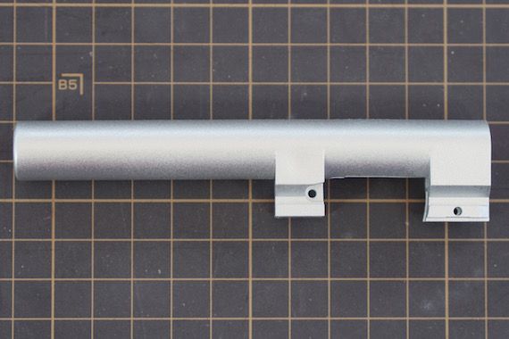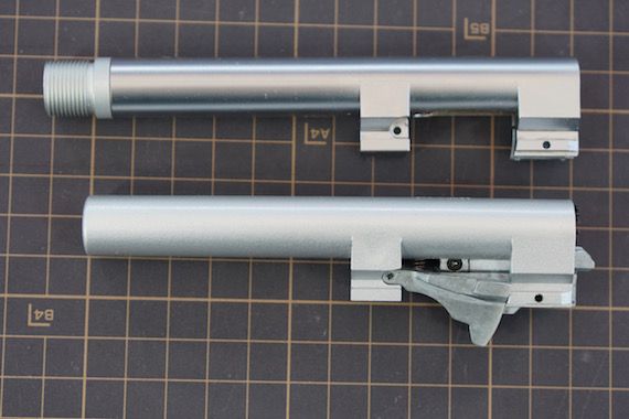 上のメッキバレルと比べると、さすがに粒子の粗さが分かりますが先端のアルミ部分と比べると遜色の無い仕上がりになりました。元のバレルからインナーバレルやロッキングブロックを組み込んで完成です。