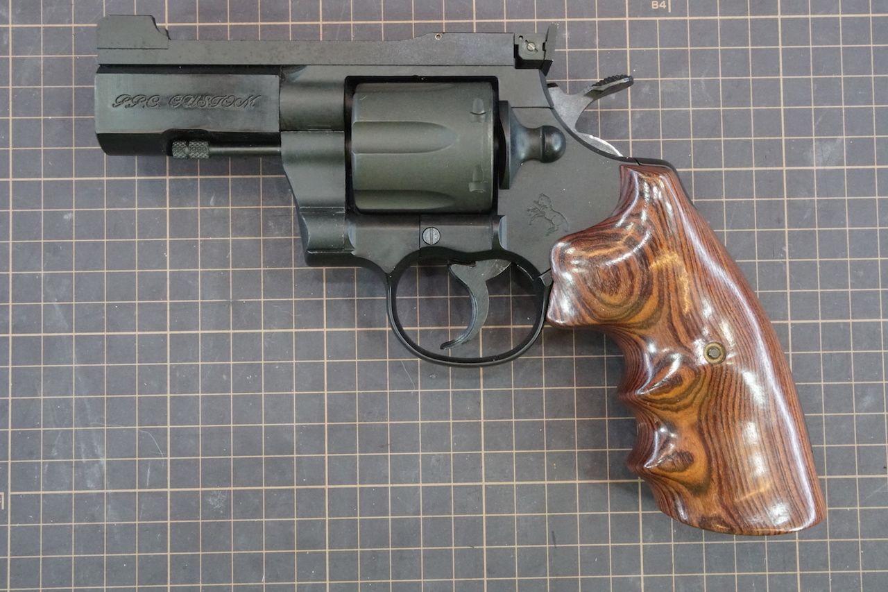 パイソンPPCカスタム用の木製グリップは3種類あって、MGC時代の初期モデルに使われた”ナス型”のラウンドタイプとそれ以降に使われたスクエアタイプ。そして今回紹介するTAITO時代のHOGUEグリップです。