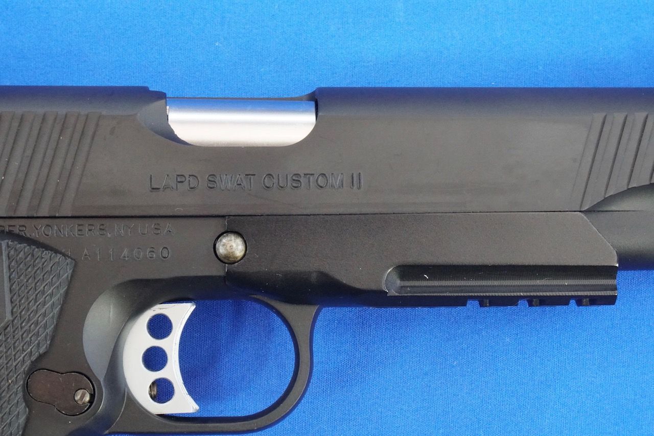 スライド右側刻印は「LAPD SWAT CUSTOM Ⅱ」となっていますが、「L.A.P.D.」じゃ無いの?と思うんですが、WAの刻印も「LAPD」のようなのでこれが正しいようです。フレーム刻印もしっかり