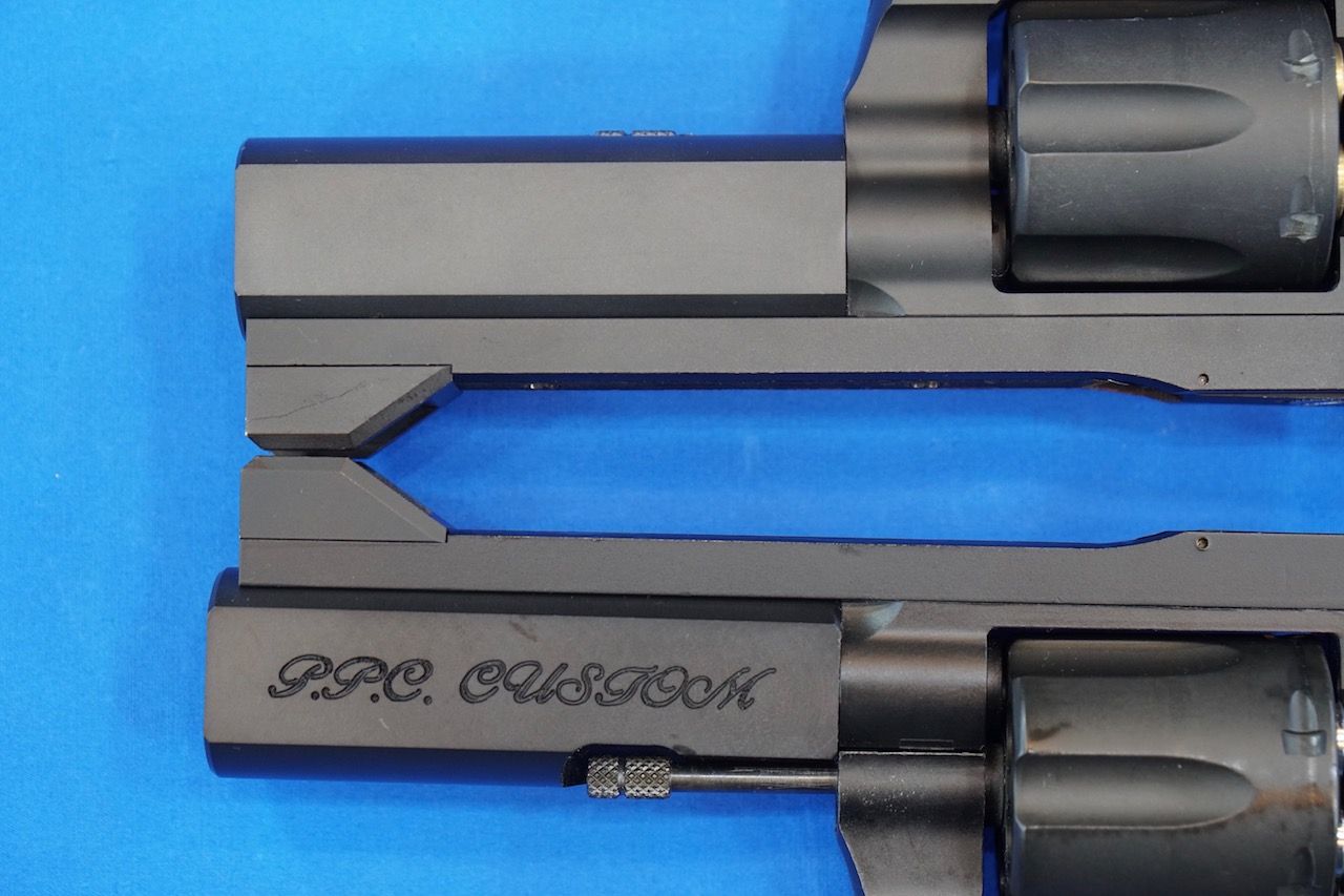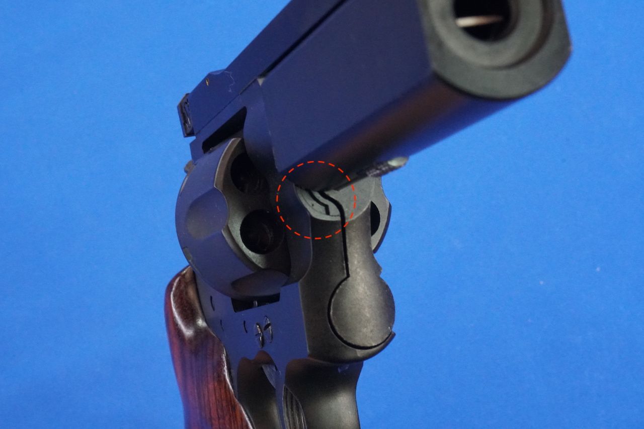PPCカスタムシリーズの外見上の欠点の一つはフレームのバレル基部にある半円形の溝。オリジナルパイソンバレルを取り付けるときの位置決めの溝だと思われますが、ブルバレルにしたことで見事に露出してます。この部分はMGC時代のPPCカスタムも同じだったので、ほとんど気にしてなかったって事ですね。