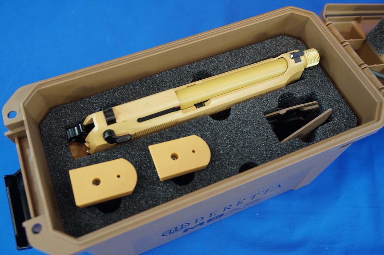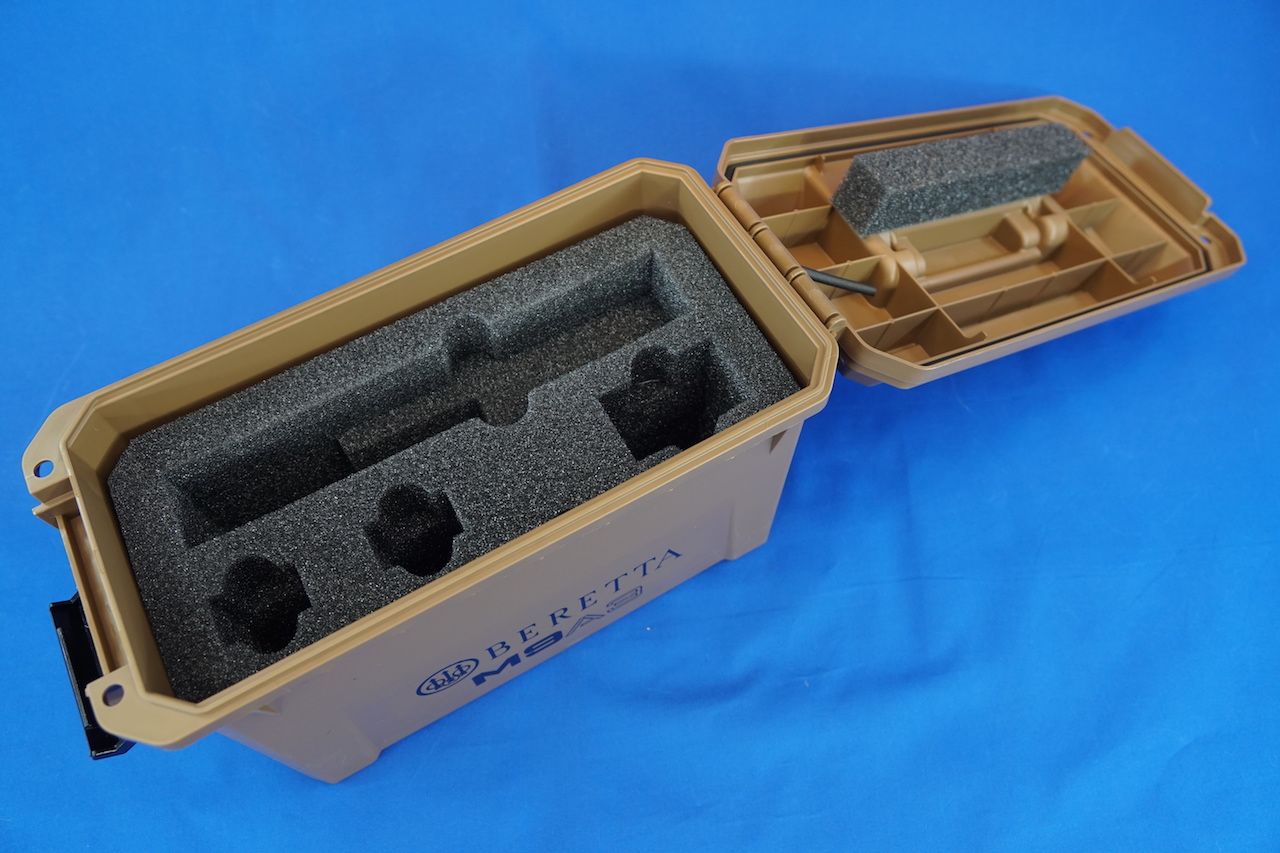 実銃のベレッタM9A3は、このコンテナ風のケースに入れられて販売されているという記事を見てから、このケースが欲しくて仕方なかったのですが、ようやく手に入れました。国内で買うと現地価格の倍ぐらいになってしまいますが、個人輸入する送料や手間を考えると妥当なところですかね。