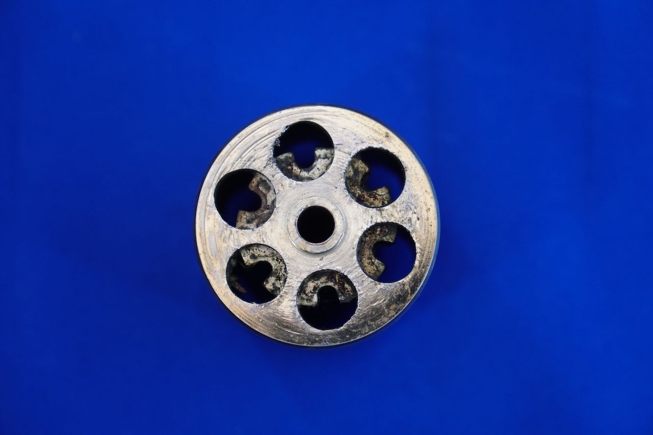 入手後バラしてよく見てみるとシリンダー前面は発火の後で汚れていますが、キャップ火薬以前のモデルとしては汚れは軽妙で、発火数自体が少なかったのと発火後のメンテはなされていたようです。ここは研磨とクリーニングで何とかなりそうです。
