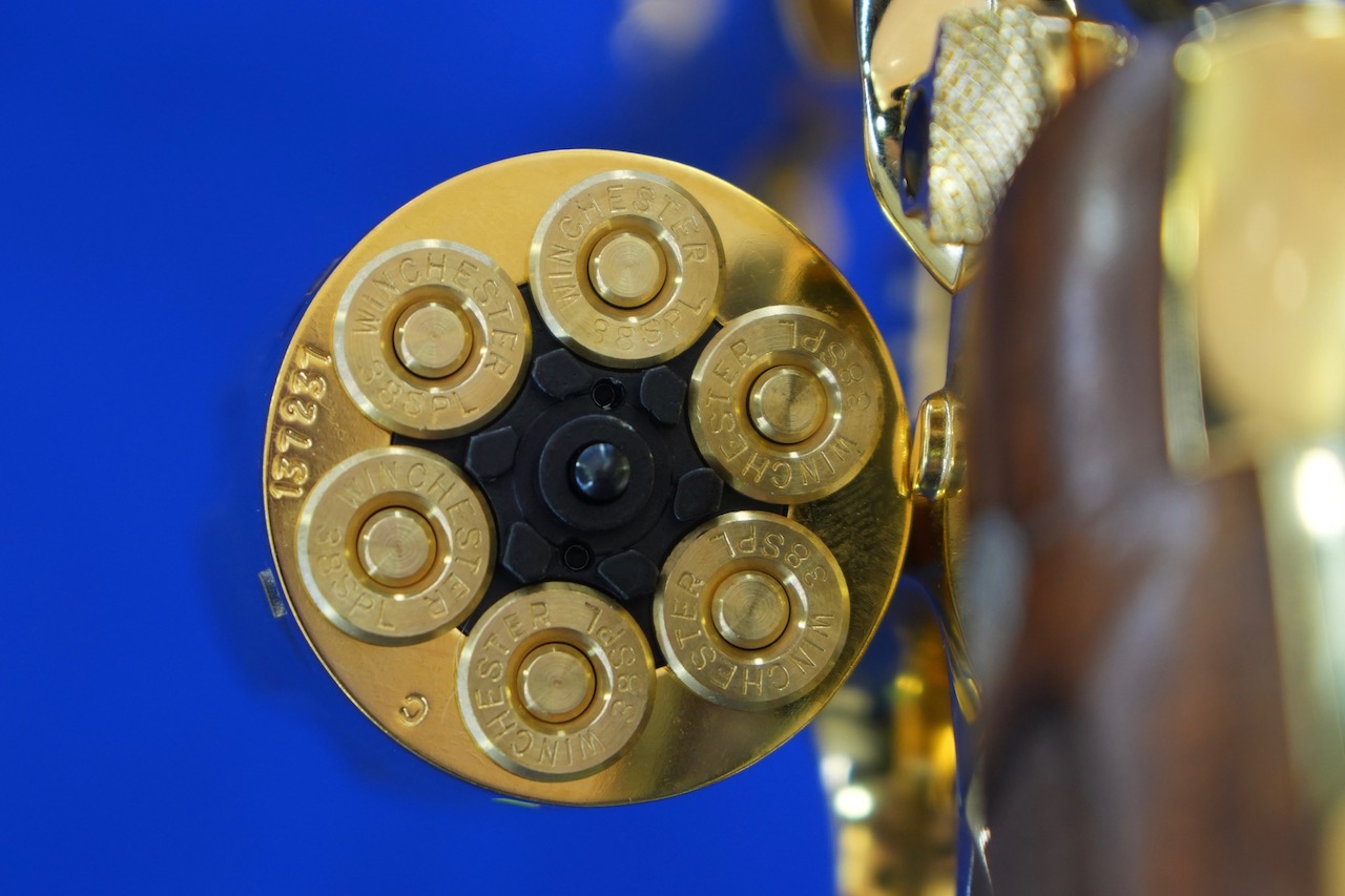 右側バレルには「38 S.&W. SPECIAL CTG」の使用カートリッジ表記。この当時は開発者であり正式名の「S.&W. 」をわざわざ表記していたんですね。バレル下のロッキングボルトの再現も良い感じで、バレルとエジェクターロッドのスキマが良いですね。