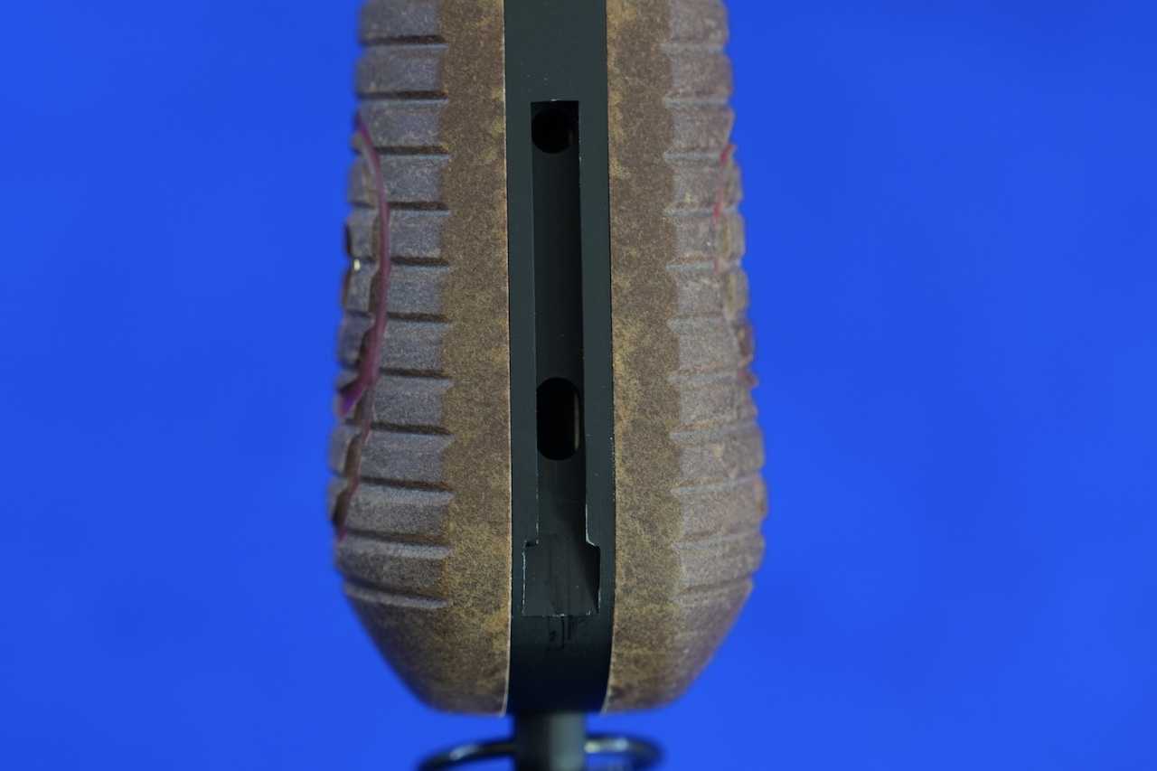 もう一つはストックの取付溝。実銃ストックが無いので分かりませんが、このモデルオリジナルの溝サイズと固定穴になっています(画像で見ると固定穴とかの形状は近いようですが)。オプションでストックホルスターを出す計画だったようですけど、未だに発売されていません(強度的な問題があったのかもしれませんが)。