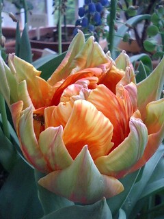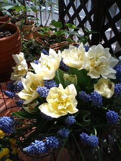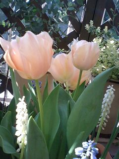 さわやかですね~気持ちがいいです。 昨日はかわいく咲いていたチューリップですが、この暖かさ・・・いやこの暑さで、咲くというより、開きまくってます。今日はこんな感じ。 たぶん、左みっつがクリームアップスターで、一番右がアンジェリケだと思う・・・同じように見えますね。タグの写真の色より全然薄い色です。栄養不足かしら?アプリコットビューティーはこんなになっちゃた・・・ でもね、 モントレーとムスカリと一緒に花瓶にいけたら、あら、すてきじゃないですか~ムスカリとチューリップってとても相性がいいですね♪今年の冬は白いムスカリを買い足そうと思います。 チューリップは買わないけど 先日、私のお尻でポキっと折れてしまったカランコエですが、花瓶の水にメネデールを入れておいたら、根がでてきました!挿し木にしてみましょう。 最後に美しい胡蝶蘭を 勤め先の老人ホーム開設記念に、ご入所者のご家族からお祝いのお花が届きました。やはり胡蝶蘭は気品がありますね。