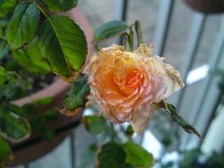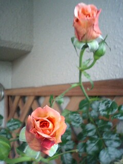 昨日の母の日母に贈った花台と、 るなさんが作ってくれたカレー特大にんじん・・・おいしかったよ~ さて、今日咲いたバラは3種。 まずはミニバラの プライドインジョイあ、うどんこが・・・ ジュリアとてもシックな色がお気に入りです 去年は一番多くの花を咲かせてくれた ピンクシフォン 蕾がとっても綺麗なんですあ、またうどんこ・・・ 今年は何でこんなにうどんこが大発生しているのでしょうか?去年と違うのは1、 鉢数が多くなった→風通しが悪くなった?2、 土を変えた→土が悪かった?3、 元肥にマグァンプKを使用→バラ専用の元肥では無い為、バランスが悪く病気に弱い苗になってしまった?来年の植え替えはバラ専用の土と肥料を使う事にしようと思います。 葉はうどんこだらけですが、花はきれいに咲いてます 開き始めは変な形でしたが、形が整ってきたブラスバンド 昨日、開いたばかりのゲルベダグマー・ハストラップはもう散り始めています花期 短っ!申し訳ございませんが、あなた様は老人ホームへの地植えを検討させて頂く事と致します。
