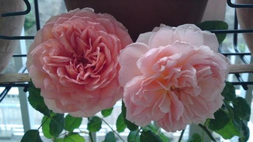 おはようございますきょうも小太郎は元気です! *さて、今朝のベランダのバラ達・・・ イングリッシュローズのアブラハム・ダービーは小ぶりの二番花を咲かせています。エブリンのような咲き方ですが、間違いなくアブラハム・ダービーの枝から出ています。とってもいい香りです * あまり生育が良くないブラスバンドですが、二番花を咲かせています。本当ならば株を充実させるために、咲かせない方がいいのかも知れませんので、早めに切り花にしようと思います。 * とても細い枝に二個目の花を咲かせたブレス・オブ・ライフこれもすぐに切り花にします。 * まっすぐなシュートをたくさん出してとても元気なハニーブーケ大好きな香りがします。これは、お気に入りのバラになりました。 * 絶え間なく咲き続けているフレグラントアプリコット咲いている花の下にもたくさんの蕾が控えています うどんこに悩まされながらも、常に咲いているバラを見られるのはほんとうに幸せです・・・