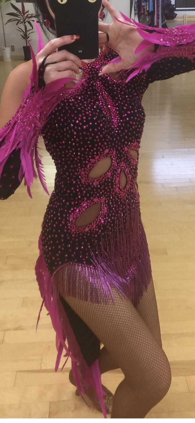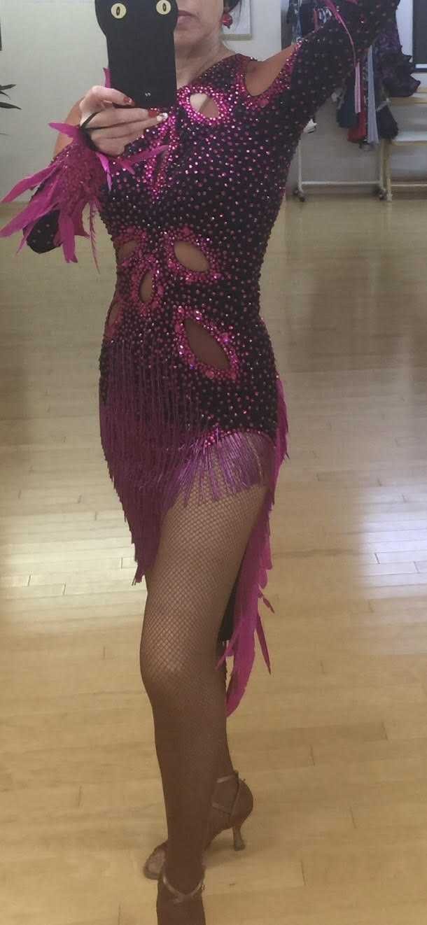 日本でダンスをされていたプロの方(現在はご引退)に掲載をご依頼いただいました黒&ピンクの長袖のラテンドレスです。