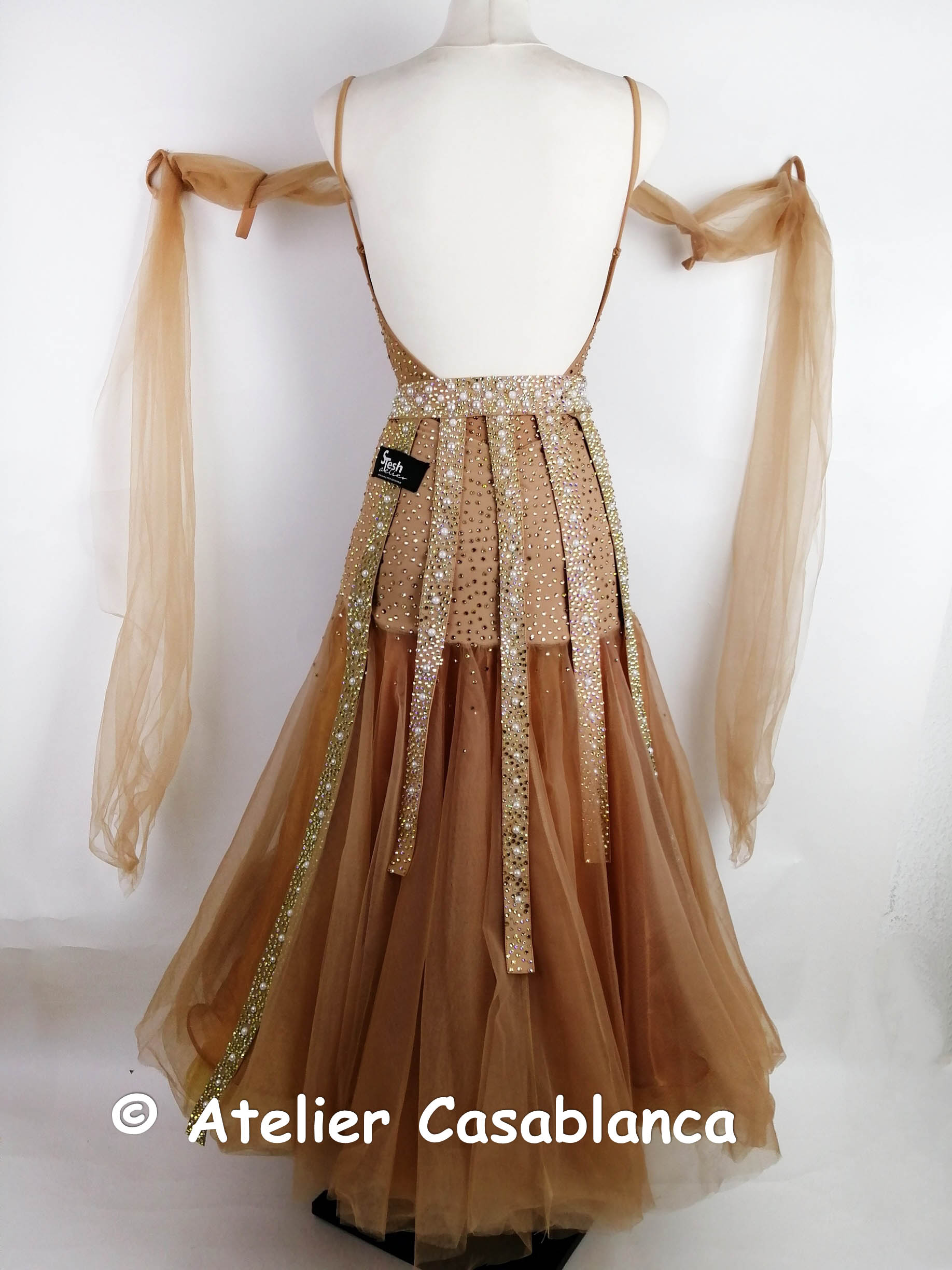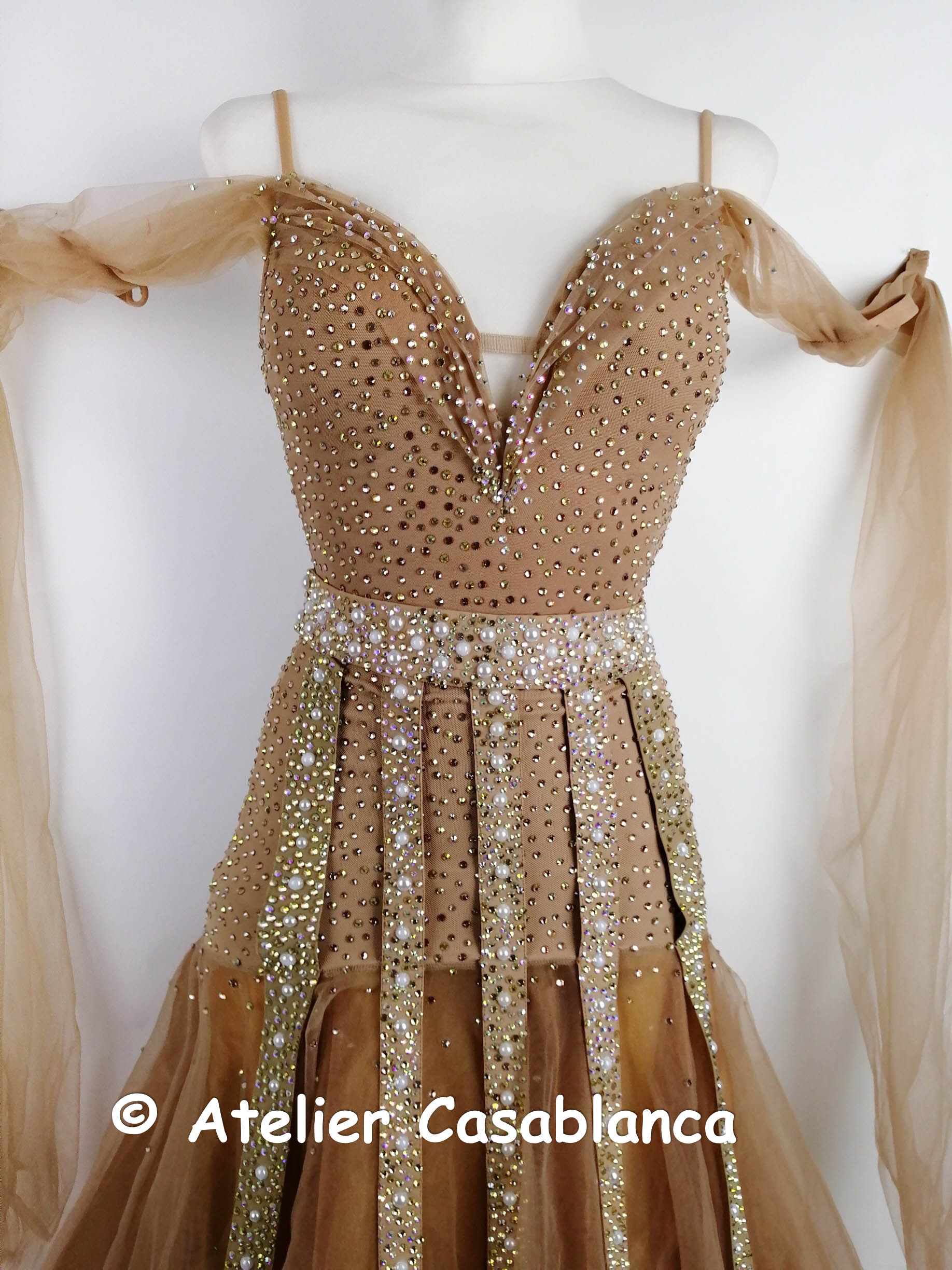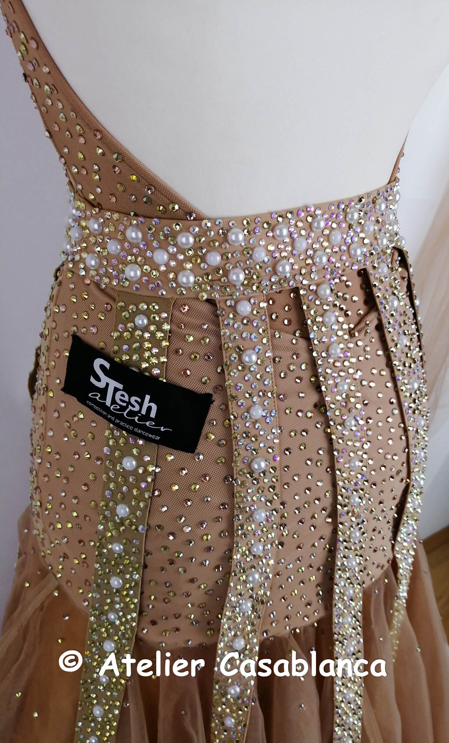 ブラックプールファイナリストでウクライナのチャンピオン、マリア・サフチューク選手のためにステッシュアトリエが制作したベージュ&ゴールドのスタンダードドレスです。マリア・サフチューク選手デモ用のドレスで、試合では着用されていません。
