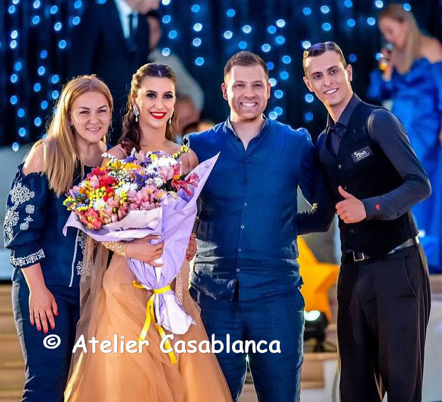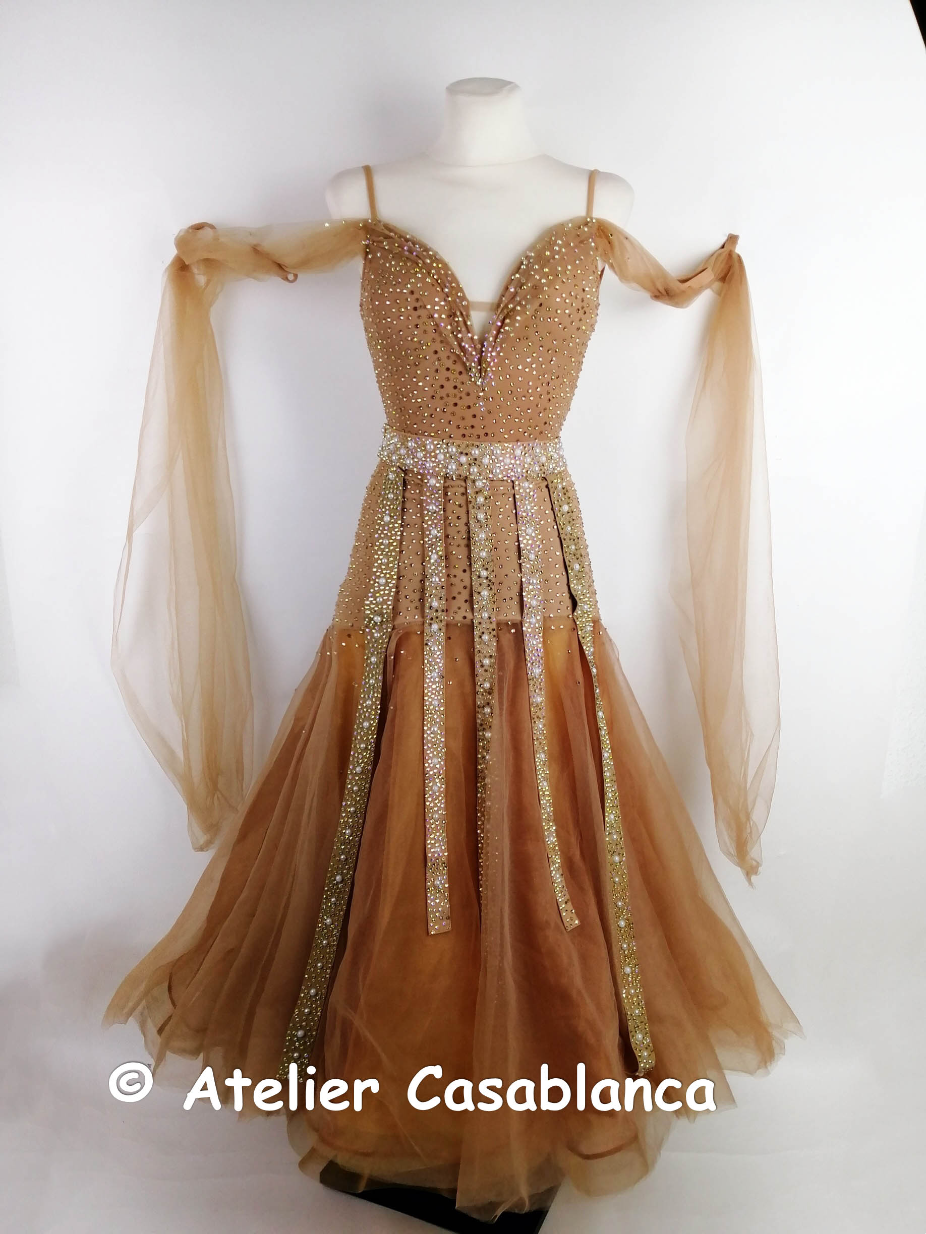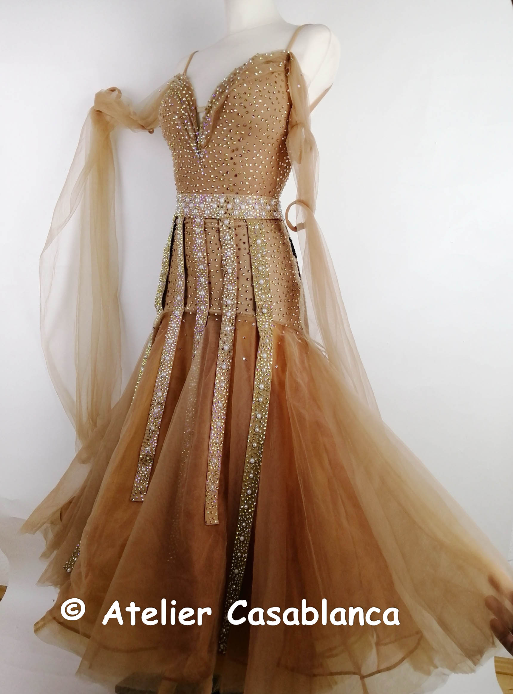 ブラックプールファイナリストでウクライナのチャンピオン、マリア・サフチューク選手のためにステッシュアトリエが制作したベージュ&ゴールドのスタンダードドレスです。マリア・サフチューク選手デモ用のドレスで、試合では着用されていません。