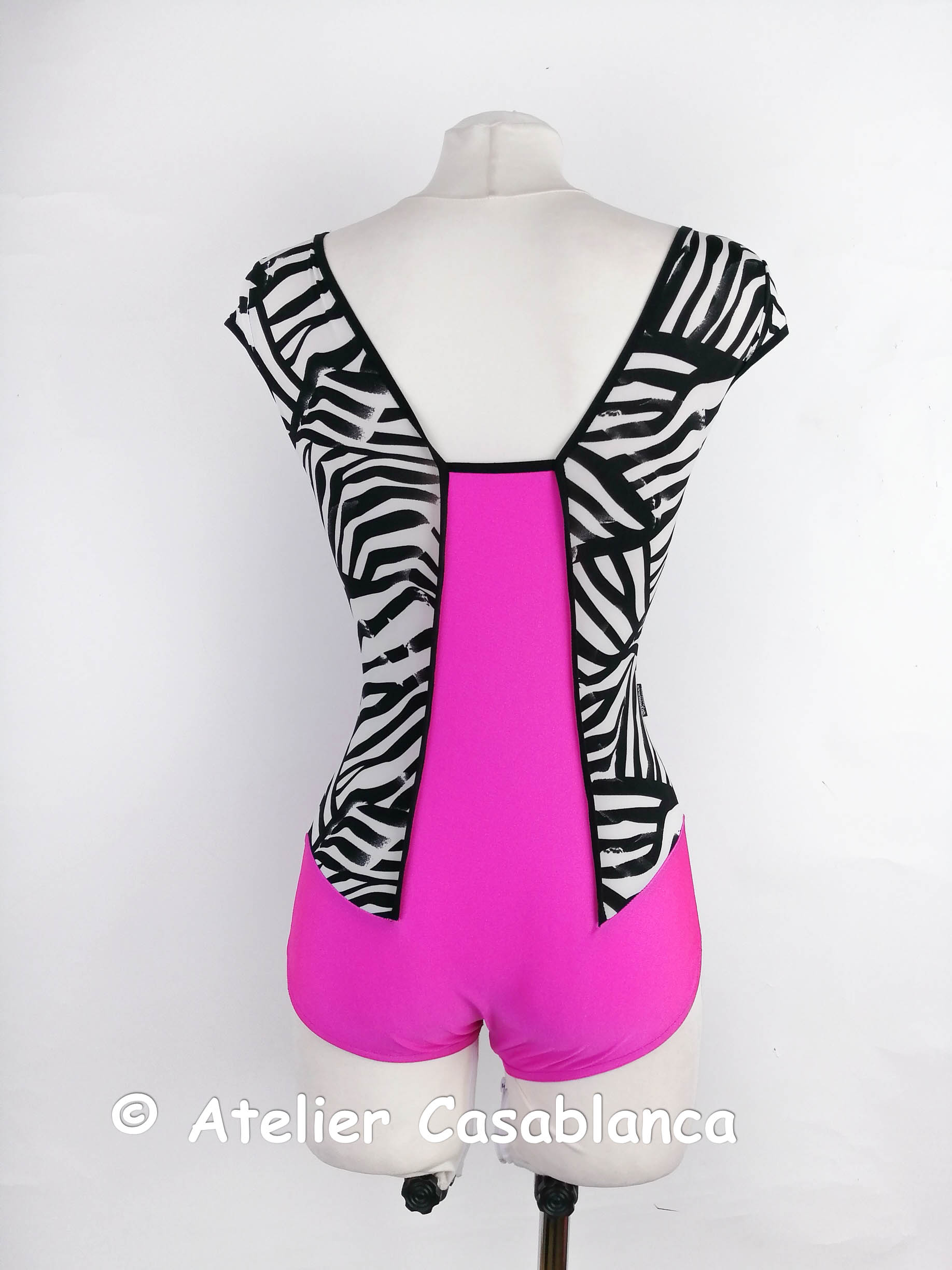 ピンクのストレッチライクラにゼブラ柄のストレッチライクラ素材を組み合わせた、2種類の布のコンビネーションが大変美しいレオタードです。