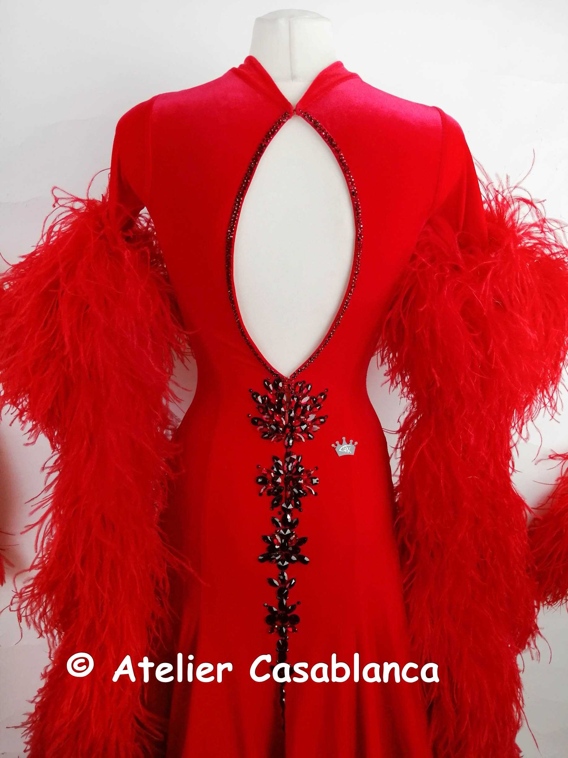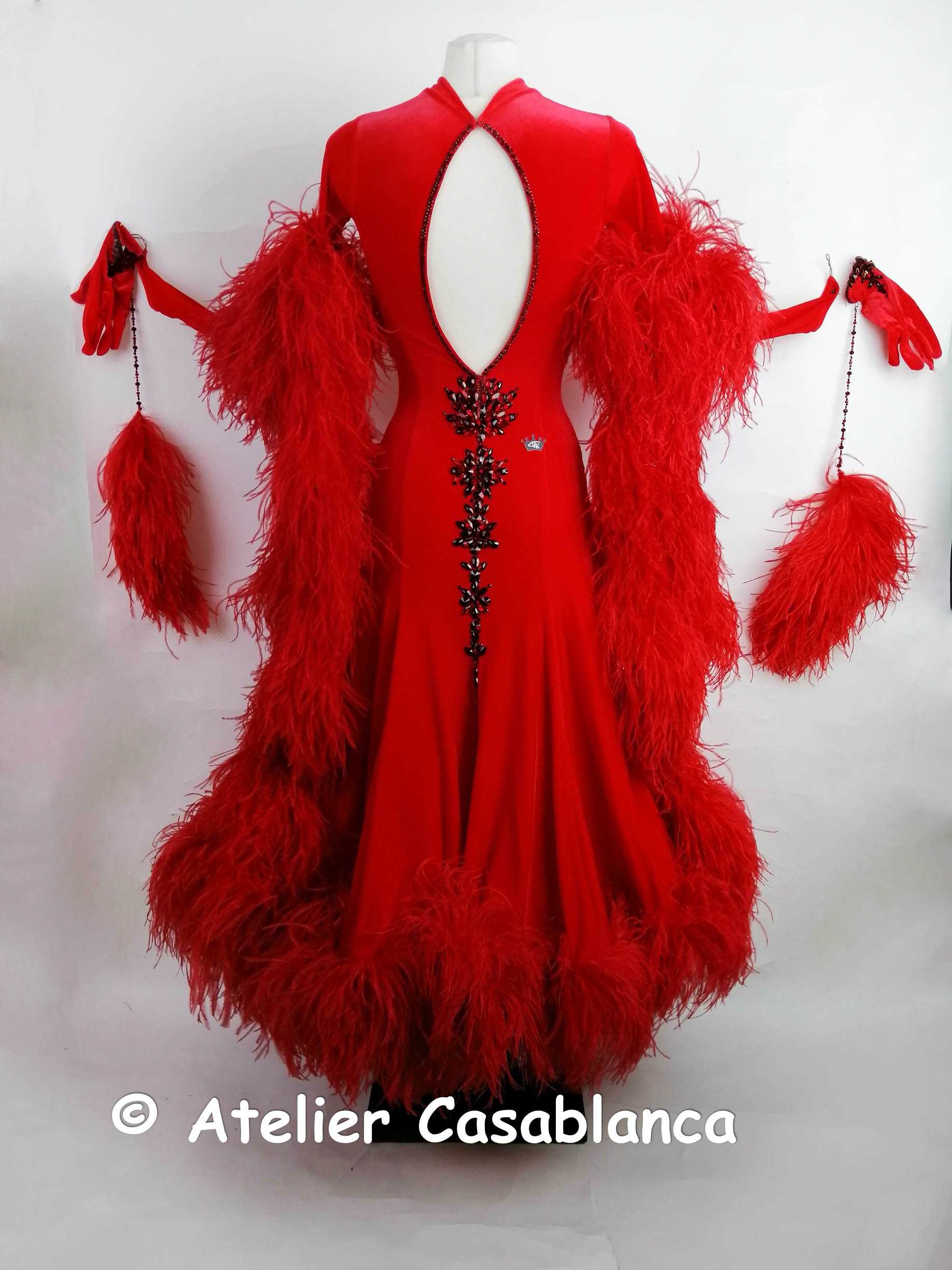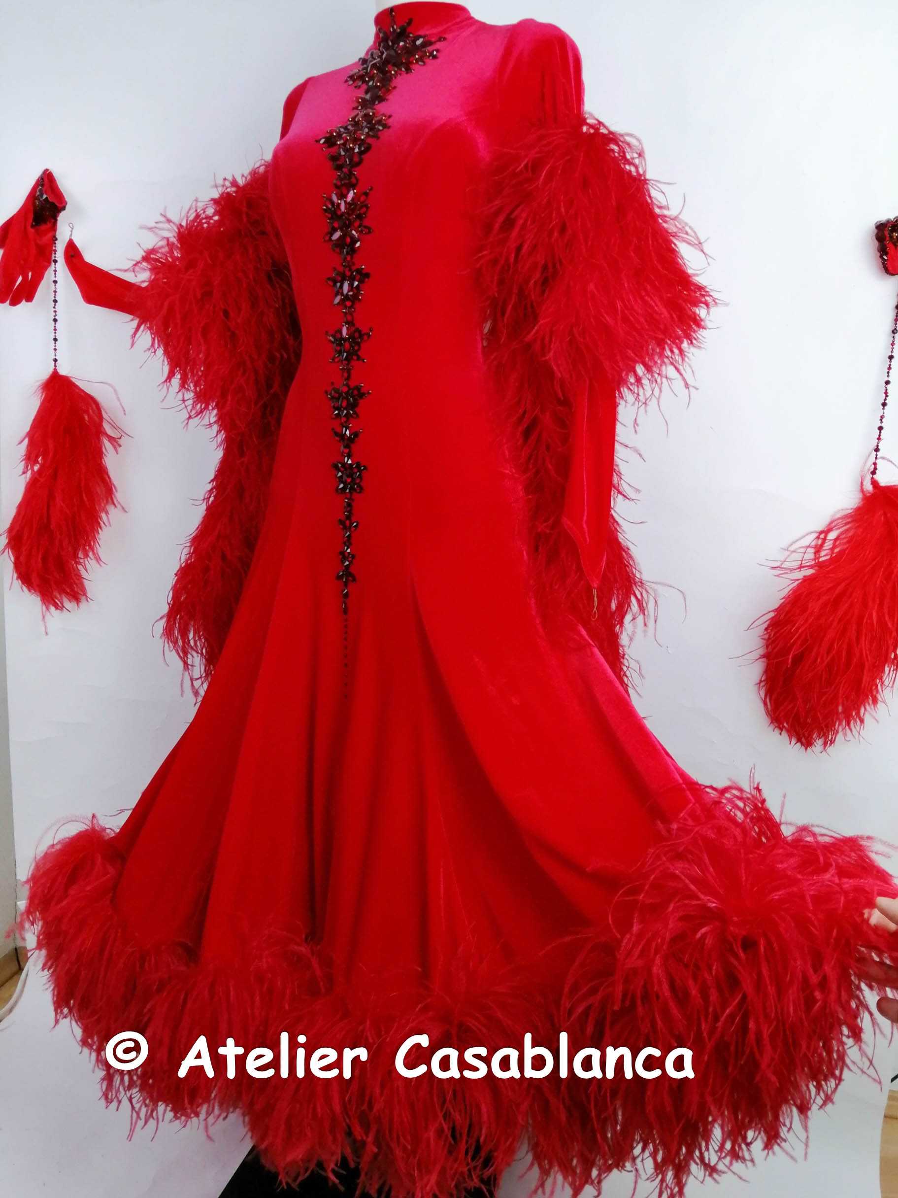 リトアニアのラグジュアリーダンスドレスブランドで、世界のトップクラスの選手の多くに絶大な人気を誇る「DLK」がブラックプールシニアファイナリストであるリトアニア選手のために制作した、総ベルベット、贅沢に使いまくったオーストリッチの羽、大きな石のゴージャスな装飾が大変美しく、上品で大変素晴らしい赤の長袖のスタンダードドレスです。