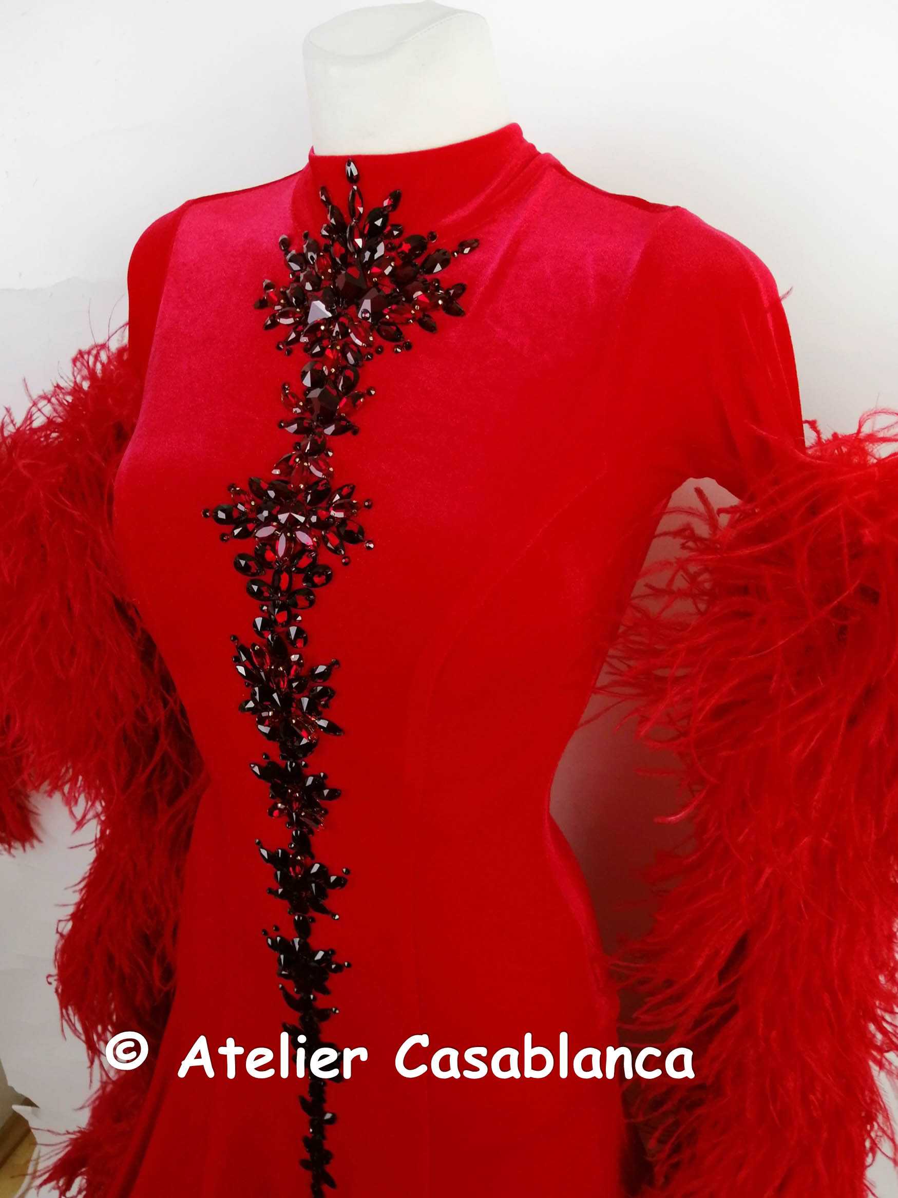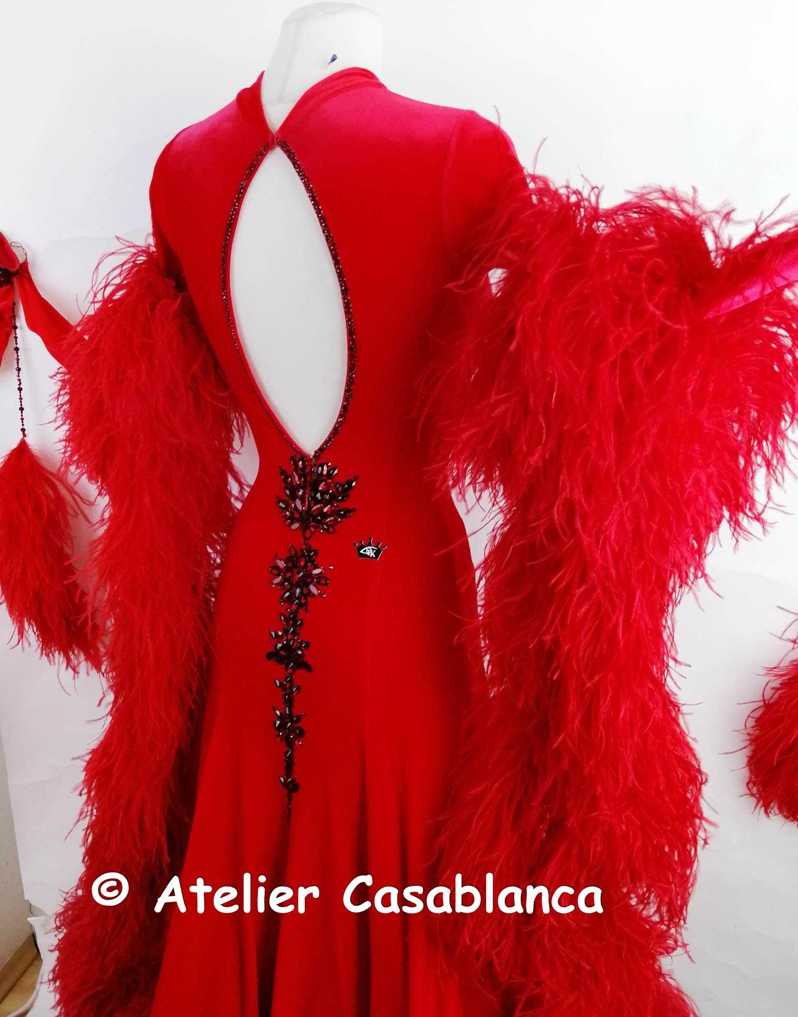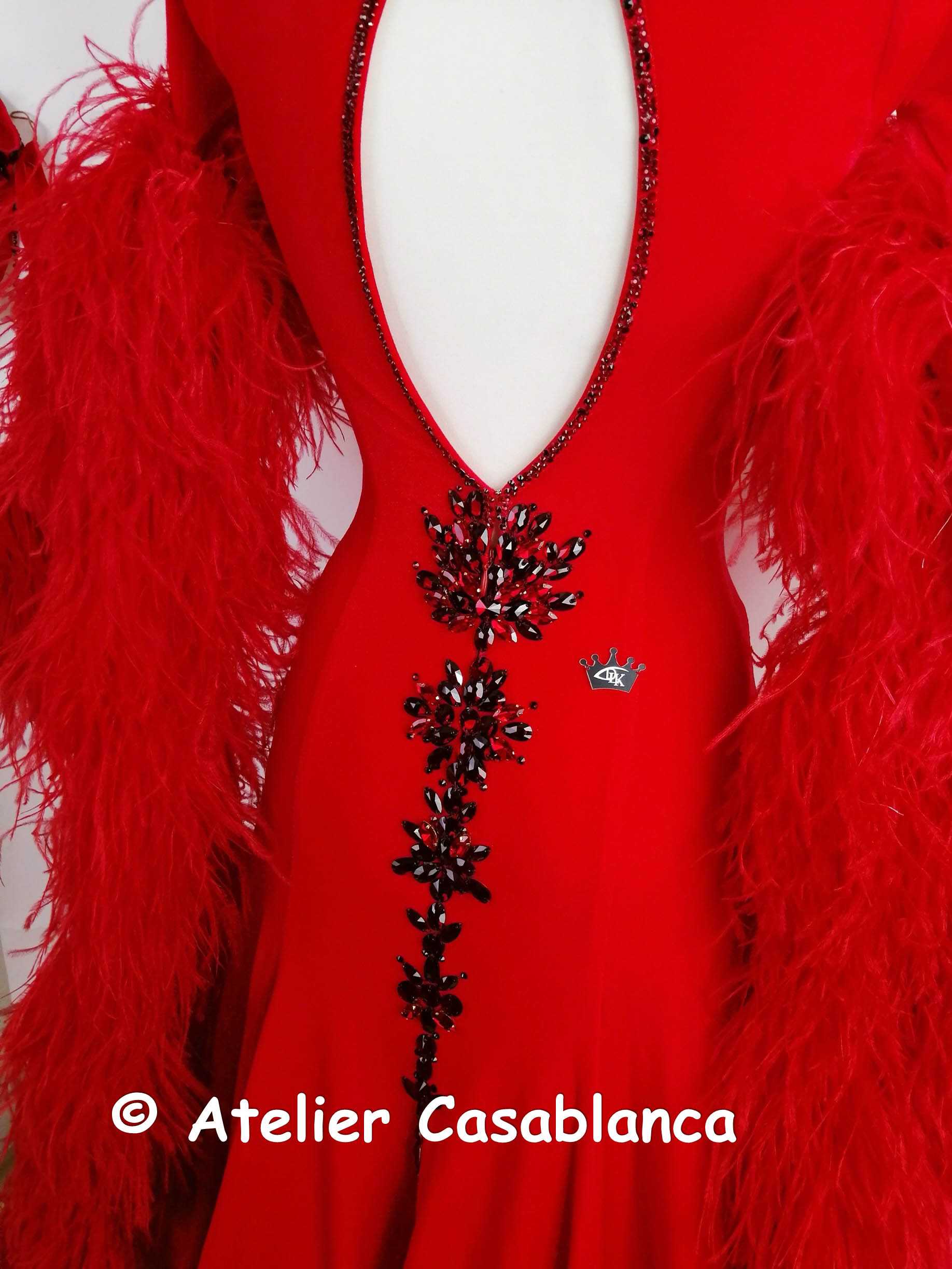 リトアニアのラグジュアリーダンスドレスブランドで、世界のトップクラスの選手の多くに絶大な人気を誇る「DLK」がブラックプールシニアファイナリストであるリトアニア選手のために制作した、総ベルベット、贅沢に使いまくったオーストリッチの羽、大きな石のゴージャスな装飾が大変美しく、上品で大変素晴らしい赤の長袖のスタンダードドレスです。
