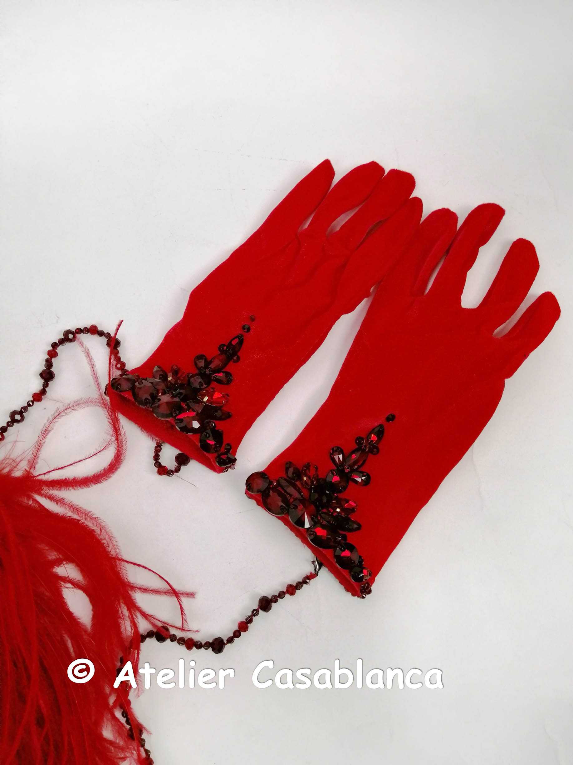大きな石の装飾が美しい赤の手袋からはスワロフスキビーズのチェーンの先にオーストリッチの羽が垂れ下がったフロートが付属しています。